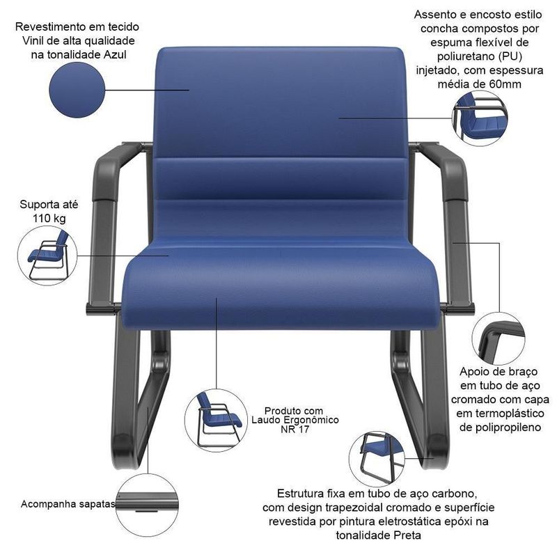 Cadeira De Escritório Recepção Com Braço Fixa Preta Lev P03 Vinil Azul - Lyam DecorDescubra a harmonia perfeita entre modernidade e conforto com a Cadeira de Escritório Base Preta Lev, da Lyam Decor. Com um design robusto e elegante, essa cadeira com braço é a escolha ideal para ambientes que buscam aliar estética e funcionalidade, seja em salas de espera, escritórios ou recepções.O acabamento em pintura eletrostática garante durabilidade e resistência, ao passo que a estrutura robusta, unida ao assento confortável, estilo concha, proporciona uma experiência única, ideal para horas de uso, sem perder o charme. Versátil e estilosa, a Cadeira de Escritório Lev é mais do que um simples mobiliário; é a peça que transforma simples momentos de espera em experiências agradáveis. Aposte no design moderno e na qualidade que fazem dessa cadeira fixa uma referência em conforto e elegância. Adicione ao seu carrinho e aproveite! Dimensões da Cadeira (L x A x P) 77 x 82 x 66 cm Medidas Internas: Largura do encosto: 60 cm Assento (L x P): 60 x 49,5 cm Altura do chão ao assento: 42,5 cm Características: Estrutura fixa em tubo de aço carbono, com design trapezoidal cromado e superfície revestida por pintura eletrostática epóxi na tonalidade Preta para maior proteção contra corrosão e durabilidade. Apoio de braço em tubo de aço cromado com capa em termoplástico de polipropileno. Revestimento em tecido Vinil de alta qualidade na tonalidade Azul. Assento e encosto estilo concha compostos por espuma flexível de poliuretano (PU) injetado, com espessura média de 60mm. Acompanha sapatas para evitar o contato direto do metal com a superfície de apoio. Peso máximo suportado 110 kg. Produto com Laudo Ergonômico NR 17. - Por se tratar de estofado as medidas podem ter uma pequena variação de até 3 cm. - A tonalidade do produto real poderá ter ligeira variação devido o lote de tecidos. Observações importantes: - Produto para uso residencial em ambiente interno, não devendo ficar exposto diretamente ao sol, calor e umidade excessivos. - Pode haver alguma diferença de tonalidade entre a imagem e o produto real, por conta do tratamento de imagens e a calibração de cores do seu monitor. - As imagens são meramente ilustrativas, não acompanham objetos de decoração e eletrônicos. - Ao receber a mercadoria, o cliente deve verificar as condições da embalagem, caso haja alguma avaria não assine o comprovante de recebimento e entre em contato com nossa loja para orientações. - Montagem, desmontagem e outras instalações serão de responsabilidade do cliente. Não nos responsabilizamos, no ato da entrega, por subir escadas/elevadores ou pelo transporte por guincho em apartamentos. Eventuais despesas são de responsabilidade do comprador. - Confira as dimensões do produto e certifique-se de que passará normalmente por supostos elevadores, portas, escadas e/ou corredores de sua residência. SupplierSimpleName: Cadeira de Escritório Recepção com Braço Fixa Preta Lev P03 Vinil Azul - Lyam Decor | ProductWidth: 77 cm | ColorFamily: Azul | Com apoio de braços: Sim | Color: Azul | Modelo detalhado: Lev com Braços Base Preta | ProductContents: 01 Cadeira, manual de instruções | Tipo de cadeira de escritório: Cadeira Recepção, Sala de Espera | OriginState: PR | ProductHeight: 82 cm | ProductWeight: 15 kg | ProductInstructions: Produto para uso em ambiente interno, nao devendo ficar exposto ao sol, calor e umidade excessivos. | ProductLength: 66 cm | SizeDescription: Altura: 82 cm x Largura: 77 cm x Profundidade: 66 cm | Modelo: Lev | Cor: Azul | Materiais do aro para pés: na | ColorSimple: Azul | ColorSupplier: Azul | Formato de venda: Unitário | Model: Lev | Com aro para pés: Não | OriginCountry: Brasil | ProductWarranty: 90 dias após o recebimento do produto | MaterialFamily: Vinil | Material: Tubo de Aço Carbono, Espuma Flexível Poliuretano, Vinil | Com rodas: Não | Número de registrocertificação INMETRO: ABNT NBR 13962, ABNT ABNT NM 300, NR 17 | Material do estofamento: Vinil | Requer montagem: Sim