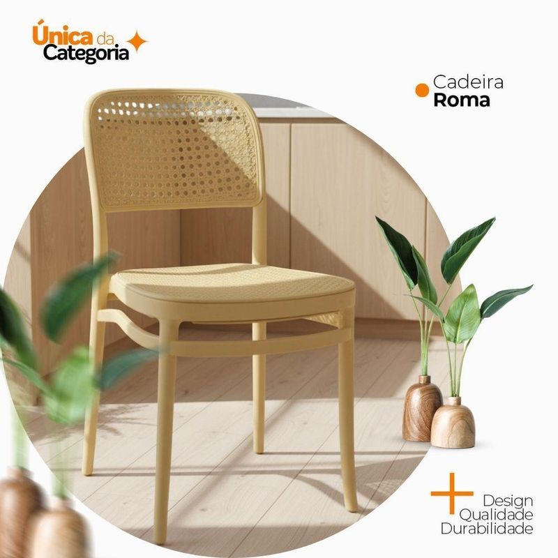 Cadeira De Jantar Roma Para Sala E Cozinha Bege Cadeira de Jantar Roma para Sala e Cozinha BegeDesign e EstiloCom visual moderno e elegante, a Cadeira Roma traz um toque sofisticado à decoração. Seu encosto e assento apresentam leve inclinação ergonômica, garantindo conforto duradouro durante as refeições ou nas conversas à mesa.Material e DurabilidadeProduzida 100% em polipropileno de alta qualidade, a cadeira oferece excelente resistência e durabilidade. Com peso aproximado de 5?kg, suporta até 120?kg e contribui para um ambiente agradável e funcional.Conforto e PraticidadeO assento e encosto foram ergonomicamente projetados para oferecer suporte e conforto prolongado. A limpeza é simples e rápida: basta um pano úmido para manter a peça com aspecto impecável.Dimensões e Especificações Técnicas:Altura total: 85?cmLargura total: assento varia entre 34?cm a 41,5?cmProfundidade total: 42?cmComprimento: 42 cmGarantiaContempla 3 meses de garantia contra defeitos de fabricação, reforçando a segurança da sua compra. Destaques Característica: Benefício:Polipropileno Premium - Leveza, resistência e fácil manutençãoSuporta até 120?kg - Uso seguro e estabilidade para várias pessoasProjeto ergonômico - Conforto prolongado, ideal para refeições e lazerMedidas compactas - Facilmente encaixável em diferentes ambientesGarantia de fábrica - Assistência rápida e confiávelIdeal para: Salas de jantar, cozinhas gourmet, varandas, áreas de lazer ou ambientes de estar. Perfeita para quem busca design contemporâneo aliado à funcionalidadeAcompanha E-book!