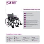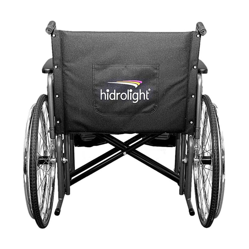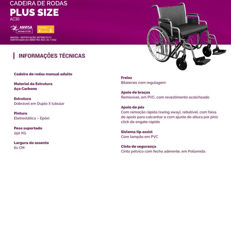 Cadeira de Rodas Plus Size Hidrolight AC30 Conheça a Hidrolight Plus Size AC30, feita especialmente para pessoas com mobilidade reduzida que precisam de mais espaço e suporte robusto! Suporta até 250kg. Super Resistente e Confortável! Características Cadeira de rodas manual adulto. Peso suportado: 250kg. Material da Estrutura: Aço Carbono. Suporta peso de até 250 kg com estrutura em aço carbono reforçado, garantindo durabilidade e segurança máxima. Assento:Com revestimento duplo em poliamida e acolchoado com espuma de 20 mm de espessura e densidade 0,016 g/cm³. Acompanha almofada em espuma de 50mm de espessura e densidade0,03g/cm³, removível com velcro, proporcionando conforto superior para uso prolongado. Rodas traseiras:24”com raios em aço carbono e aro de propulsão em aço carbono galvanizado, pneu antifuro em PU e rolamento blindado. Rodas dianteiras:8”de diâmetro x 2” de largura, com pneu maciço em PVC e rolamento blindado. Garfos:Aço Carbono. Manoplas anatômicas em PVC. Aro de propulsão em aço carbono ultra resistente, facilitando a mobilidade manual do próprio usuário. Sistema Tip Assist com tampão em PVC, ajuda a superar pequenos obstáculos e desníveis com mais facilidade. Pneus traseiros antifuro em PU e rodas dianteiras largas para maior estabilidade. Estrutura dobrável em "duplo X" tubular para facilitar o transporte e armazenamento. Apoios de braço removíveis em PVC, com revestimento acolchoado e removíveis. Apoios de pés: com remoção rápida (swing away), rebatível, com faixa de apoio para calcanhar e com ajuste de altura por pino click de engate rápido. Encosto: Fixo, com revestimento duplo em poliamida e acolchoado com espuma de 20 mm de espessura e densidade 0,016 g/cm³. Cinto pélvico de segurança com fecho aderente, em Poliamida. Protetor de roupas:Bilaterais em ABS. Bolsão multiuso (bolso traseiro para prontuário e itens pessoais). Freios:Bilaterais com regulagem. Benefícios Estrutura em Aço Carbono: Confere alta resistência e durabilidade. Design moderno e robusto que alia conforto e segurança. Suporta até 250 KG. Ultra Resistente. Combina tecnologia e resistência para o seu conforto e segurança Estrutura Dobrável Duplo X Tubular. Facilita a independência com seu sistema de propulsão manual eficiente. Praticidade total para uso diário e armazenamento em espaços reduzidos. Rolamento nas 4 Rodas. Especificações Capacidade máxima: 250 kg; Comprimento total: 124 cm; Largura total: 83 cm; Largura do assento: 61 cm; Altura total: 93,5 cm; Altura do encosto: 38 cm. Altura do assento ao chão: 52 cm; Profundidade do assento: 46 cm; Diâmetro da roda traseira: 24"; Diâmetro da roda dianteira: 8"; Largura fechada (armazenagem): 32cm; Peso: 26,0 kg.