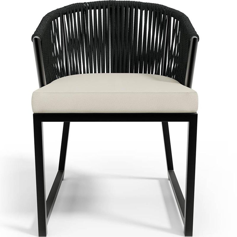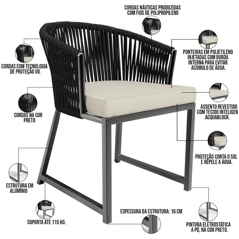 A Cadeira Bethari possui um design artesanal lindo e inovador para uso nas áreas de lazer externo, deixando o ambiente ainda mais valorizado. Trabalhada em um excelente material de alumínio na estrutura, com um lindo desenho confeccionado com cordas náuticas que é um material extremamente elegante e essencial para uma boa manutenção duradoura e longínqua do móvel, Pode ser usada perto da piscina, no jardim, sala de estar, varanda e onde mais sua criatividade desejar! Adquira já a sua! Dimensões do Produto (L x A x P) 49,5 x 78 x 55 cm Medidas Internas: Altura do assento: 48 cm Altura do chão ao braço: 66 cm Largura do assento: 50 cm Características: Estrutura em alumínio. Assento revestido com tecido acquablock. Acabamento em pintura eletrostática a pó na cor Preto, de alta resistência, sendo indicado também para áreas litorâneas. Cordas náuticas produzida com fios de polipropileno na cor Preto. Ponteiras em polietileno injetadas com borda interna para evitar acúmulo de água. Espessura da estrutura: 1,6 mm Suporta até 115 kg. - A tonalidade do produto real poderá ter ligeira variação devido o lote de tecidos. - A limpeza deve ser feita com pano levemente umedecido em água limpa, sem esfregar, não utilizar produtos abrasivos, desengordurantes, álcool ou solvente. - O produto tem aditivo anti enxofre que o torna mais resistente, mas não é recomendada a exposição por tempo indefinido ao sol, chuva, sereno e maresia. - A exposição prolongada ao sol ou maresia, pode causar desbotamento precoce da corda náutica. Observações importantes: - Produto para uso em ambiente interno e externo, não devendo ficar exposto diretamente ao sol, calor e umidade excessivos. - Pode haver alguma diferença de tonalidade entre a imagem e o produto real, por conta do tratamento de imagens e a calibração de cores do seu monitor. - As imagens são meramente ilustrativas, não acompanham objetos de decoração e eletrônicos. - Ao receber a mercadoria, o cliente deve verificar as condições da embalagem, caso haja alguma avaria não assine o comprovante de recebimento. - Montagem, desmontagem e outras instalações serão de responsabilidade do cliente. Não nos responsabilizamos, no ato da entrega, por subir escadas/elevadores ou pelo transporte por guincho em apartamentos. Eventuais despesas são de responsabilidade do comprador. - Confira as dimensões do produto e certifique-se de que passará normalmente por supostos elevadores, portas, escadas e/ou corredores de sua residência.