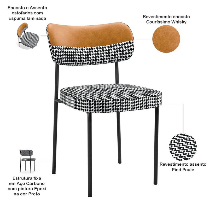 Caso você esteja buscando conforto, realce e praticidade, a Cadeira Estofada Melina vai superar todas as suas expectativas. Garante muita comodidade e otimiza o espaço, além de harmonizar com seu estilo decorativo facilmente, podendo ser utilizada em salas de estar, jantar e cozinha, além de dar um toque especial em sua decoração. Sua proposta de design suavizará seu ambiente sem passar despercebida oferecendo mais leveza e receptividade ao seu lar. Estruturada em aço carbono, contrasta lindamente com o encosto e assento estofados que são extremamente confortáveis, resistentes e aconchegantes. Você merece esta incrível combinação em sua casa, adquira já a sua! Dimensões da Cadeira (L x A x P) 49 x 77 x 54 cm Medidas Internas: Altura do encosto: 22 cm Largura do encosto: 49 cm Altura do assento ao encosto: 34 cm Altura do assento: 6,5 cm Largura do assento: 44 cm Profundidade do assento: 45 cm Altura do chão ao assento: 49 cm Características: Encosto e assento estofados com espuma laminada. Estrutura fixa em aço carbono com pintura epóxi na cor Preto. Revestimento em Couríssimo na cor Whisky e Pied Poule. Suporta até 120 kg. - Por se tratar de estofado as medidas podem ter uma pequena variação de até 3 cm. - A tonalidade do produto real poderá ter ligeira variação devido o lote de tecidos. - A limpeza deve ser feita com pano levemente umedecido em água limpa, sem esfregar, não utilizar produtos abrasivos, desengordurantes, álcool ou solvente. Observações importantes: - Produto para uso residencial em ambiente interno, não devendo ficar exposto diretamente ao sol, calor e umidade excessivos. - Pode haver alguma diferença de tonalidade entre a imagem e o produto real, por conta do tratamento de imagens e a calibração de cores do seu monitor. - As imagens são meramente ilustrativas, não acompanham objetos de decoração e eletrônicos. - Ao receber a mercadoria, o cliente deve verificar as condições da embalagem, caso haja alguma avaria não assine o comprovante de recebimento. - Montagem, desmontagem e outras instalações serão de responsabilidade do cliente. Não nos responsabilizamos, no ato da entrega, por subir escadas/elevadores ou pelo transporte por guincho em apartamentos. Eventuais despesas são de responsabilidade do comprador. - Confira as dimensões do produto e certifique-se de que passará normalmente por supostos elevadores, portas, escadas e/ou corredores de sua residência.
