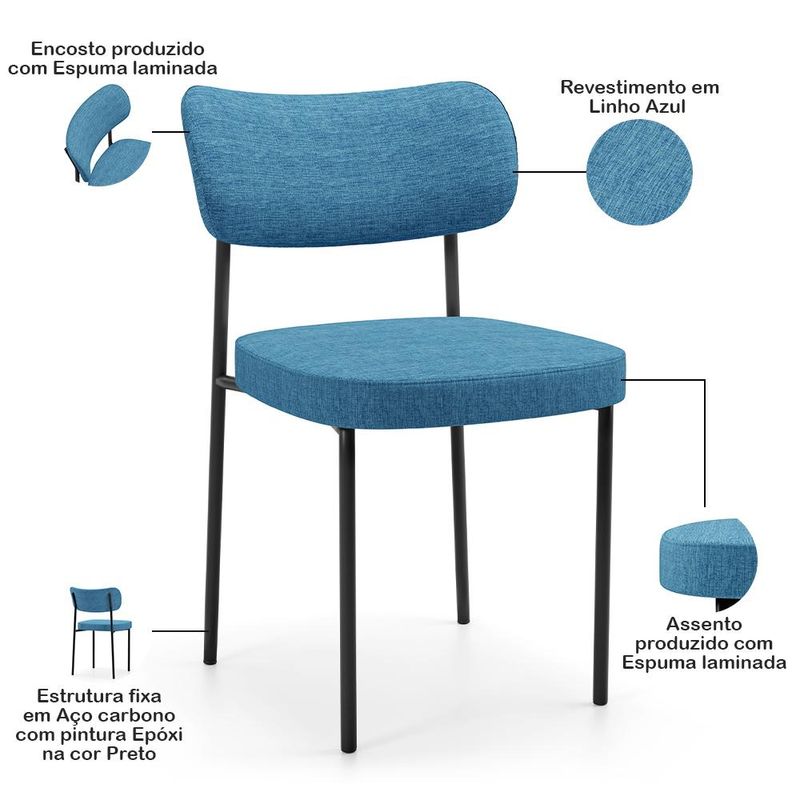 Caso você esteja buscando conforto, realce e praticidade, a Cadeira Estofada Melina vai superar todas as suas expectativas. Garante muita comodidade e otimiza o espaço, além de harmonizar com seu estilo decorativo facilmente, podendo ser utilizada em salas de estar, jantar e cozinha, além de dar um toque especial em sua decoração. Sua proposta de design suavizará seu ambiente sem passar despercebida oferecendo mais leveza e receptividade ao seu lar. Estruturada em aço carbono, contrasta lindamente com o encosto e assento estofados que são extremamente confortáveis, resistentes e aconchegantes. Você merece esta incrível combinação em sua casa, adquira já a sua!Dimensões da Cadeira (L x A x P)49 x 77 x 54 cm Medidas Internas:Altura do encosto: 22 cmLargura do encosto: 49 cmAltura do assento ao Encosto: 34 cmAltura do assento: 6,5 cmLargura do assento: 44 cmProfundidade do assento: 45 cmAltura do Assento ao chão: 49 cm Características:Encosto e assento estofados com espuma laminada.Estrutura fixa em aço carbono com pintura epóxi na cor preto.Revestimento em Linho na cor Azul.Suporta até 120 kg.- Por se tratar de estofado as medidas podem ter uma pequena variação de até 3 cm.- A tonalidade do produto real poderá ter ligeira variação devido o lote de tecidos.- A limpeza deve ser feita com pano levemente umedecido em água limpa, sem esfregar, não utilizar produtos abrasivos, desengordurantes, álcool ou solvente. Observações importantes:- Produto para uso residencial em ambiente interno, não devendo ficar exposto diretamente ao sol, calor e umidade excessivos.- Pode haver alguma diferença de tonalidade entre a imagem e o produto real, por conta do tratamento de imagens e a calibração de cores do seu monitor.- As imagens são meramente ilustrativas, não acompanham objetos de decoração e eletrônicos.- Ao receber a mercadoria, o cliente deve verificar as condições da embalagem, caso haja alguma avaria não assine o comprovante de recebimento.- Montagem, desmontagem e outras instalações serão de responsabilidade do cliente. Não nos responsabilizamos, no ato da entrega, por subir escadas/elevadores ou pelo transporte por guincho em apartamentos. Eventuais despesas são de responsabilidade do comprador.- Confira as dimensões do produto e certifique-se de que passará normalmente por supostos elevadores, portas, escadas e/ou corredores de sua residência.