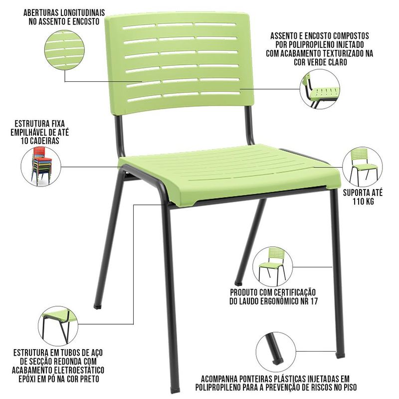 Procurando por uma cadeira versátil e moderna? A Cadeira Empilhável Kimi, da Lyam Decor, é a escolha perfeita! Com estrutura em aço tubular resistente e design clean, ela se adapta a diversos ambientes, desde escritório, área gourmet, restaurante até escolas e salão de festas. Além disso, design e funcionalidade se encontram, expressos no conforto térmico graças às aberturas longitudinais no encosto e assento, e na versatilidade de empilhar até dez unidades, de modo a facilitar o armazenamento e organização. Enfim, uma cadeira em polipropileno criada para transformar qualquer espaço com muito estilo. Aproveite e adicione agora mesmo ao seu carrinho! Dimensões da Cadeira (L x A x P) 44,3 x 78,6 x 55,9 cm Medidas Internas: Encosto (L x A): 39,8 x 25 cm Altura do chão ao assento: 48 cm Assento (L x P): 40 x 42,2 cm Características: Estrutura em tubos de aço de secção redonda com acabamento eletroestático epóxi em pó na cor Preto e ponteiras plásticas injetadas em polipropileno. Assento e encosto compostos por polipropileno injetado com acabamento texturizado na cor Verde Claro. Aberturas longitudinais no assento e encosto para melhor transferência térmica. Empilhamento máximo de até 10 cadeiras. Peso máximo suportado 110 kg. Produto com certificação do Laudo Ergonômico NR 17 Observações importantes: - Produto para uso residencial em ambiente interno, não devendo ficar exposto diretamente ao sol, calor e umidade excessivos. - Pode haver alguma diferença de tonalidade entre a imagem e o produto real, por conta do tratamento de imagens e a calibração de cores do seu monitor. - As imagens são meramente ilustrativas, não acompanham objetos de decoração e eletrônicos. - Ao receber a mercadoria, o cliente deve verificar as condições da embalagem, caso haja alguma avaria não assine o comprovante de recebimento e entre em contato com nossa loja para orientações. - Montagem, desmontagem e outras instalações serão de responsabilidade do cliente. Não nos responsabilizamos, no ato da entrega, por subir escadas/elevadores ou pelo transporte por guincho em apartamentos. Eventuais despesas são de responsabilidade do comprador. - Confira as dimensões do produto e certifique-se de que passará normalmente por supostos elevadores, portas, escadas e/ou corredores de sua residência. - Para mais informações, acesse nossa Central de Atendimento.