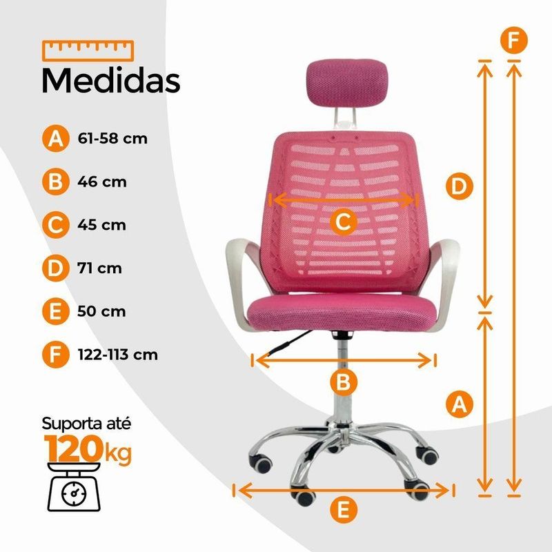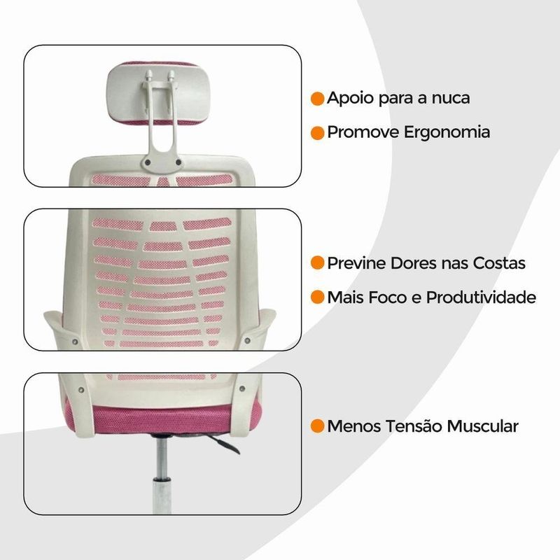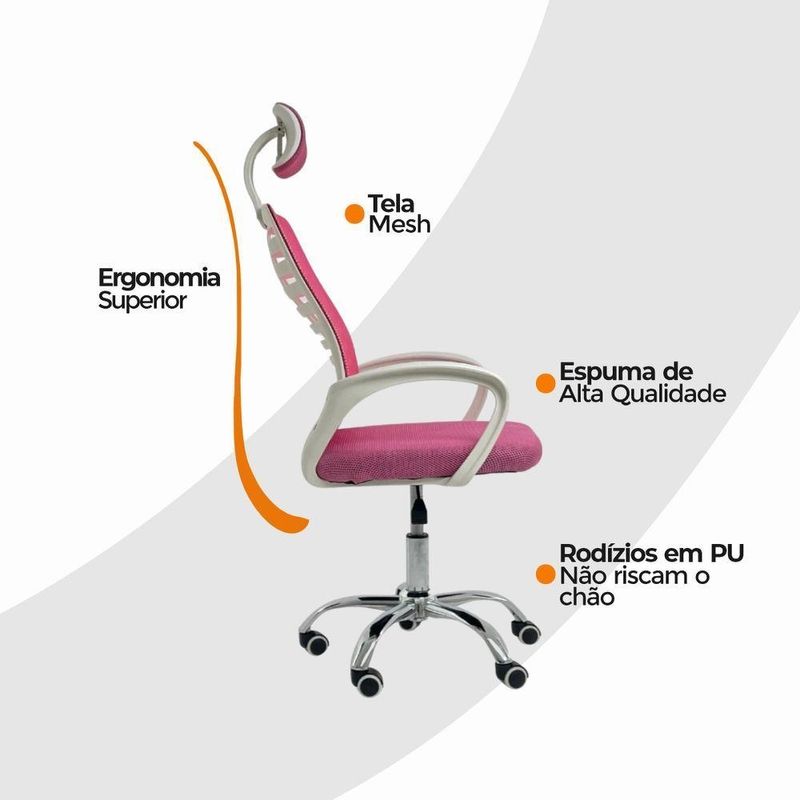 Cadeira Escritório Diretor Tela Mesh Com Encosto RosaCadeira Escritório Diretor Tela Mesh – Design Moderno e Conforto ErgonômicoGaranta conforto, estilo e praticidade no seu dia a dia com a Cadeira Diretor Tela Mesh. Desenvolvida para quem busca bem-estar e eficiência durante longos períodos de uso, ela combina design contemporâneo, estrutura resistente e ajustes ergonômicos personalizados.O encosto em tela Mesh respirável mantém a circulação de ar constante, evitando o acúmulo de calor, enquanto o assento em madeira multilaminada, revestido em nylon de alta qualidade, assegura durabilidade e conforto mesmo após horas de uso.Os apoios de braço em polipropileno (PP) foram projetados para oferecer suporte postural adequado, reduzindo a fadiga ao longo do expediente.Ideal para escritórios, home office ou ambientes corporativos, o modelo Diretor alia leveza, mobilidade e estética moderna, criando um espaço de trabalho agradável e funcional. Características Técnicas:Altura regulável: com ajuste pneumático para diferentes estaturasEstrutura: nylon e aço cromado, conferindo resistência e estabilidadeEncosto: em tela Mesh de alta ventilaçãoAssento: madeira multilaminada revestida em nylonApoio de cabeça: integrado, para suporte cervical e melhor posturaApoio de braços: em polipropileno ergonômico (PP)Rodízios: com rotação de 360º, garantindo mobilidade sem esforçoPeso máximo recomendado: 120 kgPeso: 5,5 kgRevestimento: nylon e tela MeshExtras: acompanha e-book exclusivoCom design elegante e funcionalidade inteligente, a Cadeira Diretor Tela Mesh é a escolha ideal para quem busca conforto, desempenho e bem-estar no ambiente de trabalho ou estudo.