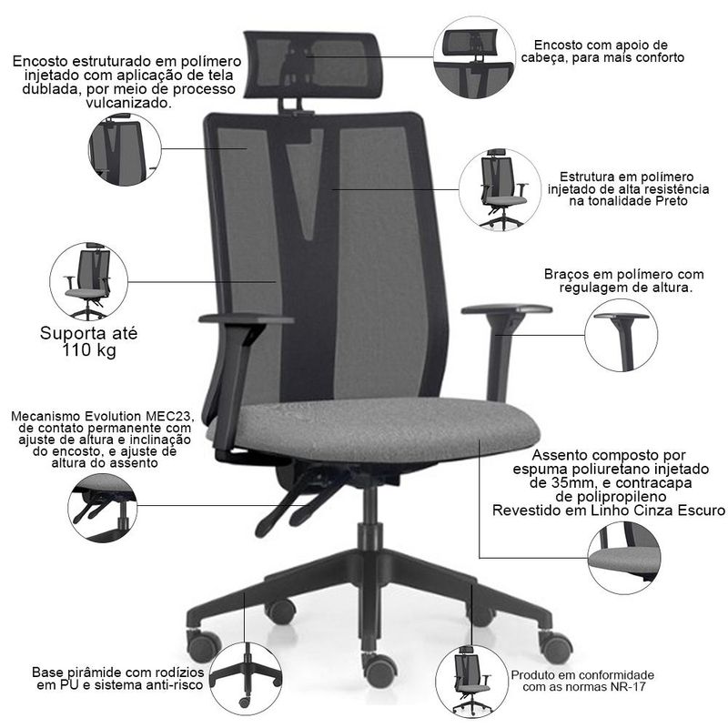 A Cadeira de Escritório Presidente Flow, da Lyam Decor, se destaca como a verdadeira protagonista do conforto e da produtividade. Com um design moderno que une estética e funcionalidade, ela se adapta perfeitamente ao seu estilo, seja no escritório convencional ou no aconchego do home office. Equipada com um mecanismo Evolution, um sistema de contato permanente, essa cadeira giratória abraça as suas necessidades, permitindo ajustes precisos na altura do assento, do encosto e dos braços. Cada detalhe foi pensado para proporcionar um suporte ideal, respeitando o biotipo do usuário e promovendo uma postura saudável durante longas horas de trabalho. Já a base pirâmide, adornada com rodízios em PU e sistema anti-risco, desliza suavemente sobre qualquer superfície, garantindo movimentos ágeis e seguros. Por fim, o encosto com apoio de cabeça completa a experiência, permitindo que você se concentre no que realmente importa, enquanto sua mente flui livremente. Com a cadeira presidente Flow sua jornada laboral será transformada em uma experiência prazerosa e produtiva. Sente-se, ajuste-se e deixe a inspiração fluir! Dimensões da Cadeira (L x A x P) 71 x 111 x 71 cm Medidas Internas: Altura máxima regulável: até 121,5 cm Altura regulável do chão ao assento: 44,5 a 54,5 cm Altura do chão aos braços: 62 a 72,5 cm Assento livre (L x P): 51 x 49 cm Encosto (L x A): 49 x 58 cm Encosto de cabeça (L x A): 29,4 x 13 cm Profundidade total com o encosto reclinado: 80 cm Características: Estrutura em polímero injetado de alta resistência na tonalidade Preta. Assento estofado com espuma injetada em poliuretano de 35mm e contracapa de polipropileno. Revestimento em tecido Linho de alta qualidade na tonalidade Cinza Escuro. Encosto estruturado em polímero injetado com aplicação de tela dublada, por meio de processo vulcanizado. Mecanismo Evolution MEC23, de contato permanente com ajuste de altura e inclinação do encosto, e ajuste de altura do assento, de acordo com o biotipo do usuário. Braços em polímero com regulagem de altura. Encosto com apoio de cabeça, para mais conforto. Base pirâmide com rodízios em PU e sistema anti-risco. Peso máximo suportado 110 kg, com uso recomendado de 8 horas diária. Produto em conformidade com as normas NR-17. - Por se tratar de estofado as medidas podem ter uma pequena variação de até 3 cm. - A tonalidade do produto real poderá ter ligeira variação devido o lote de tecidos. Observações importantes: - Produto para uso residencial em ambiente interno, não devendo ficar exposto diretamente ao sol, calor e umidade excessivos. - Pode haver alguma diferença de tonalidade entre a imagem e o produto real, por conta do tratamento de imagens e a calibração de cores do seu monitor. - As imagens são meramente ilustrativas, não acompanham objetos de decoração e eletrônicos. - Ao receber a mercadoria, o cliente deve verificar as condições da embalagem, caso haja alguma avaria não assine o comprovante de recebimento e entre em contato com nossa loja para orientações. - Montagem, desmontagem e outras instalações serão de responsabilidade do cliente. Não nos responsabilizamos, no ato da entrega, por subir escadas/elevadores ou pelo transporte por guincho em apartamentos. Eventuais despesas são de responsabilidade do comprador. - Confira as dimensões do produto e certifique-se de que passará normalmente por supostos elevadores, portas, escadas e/ou corredores de sua residência. - Para mais informações, acesse nossa Central de Atendimento.