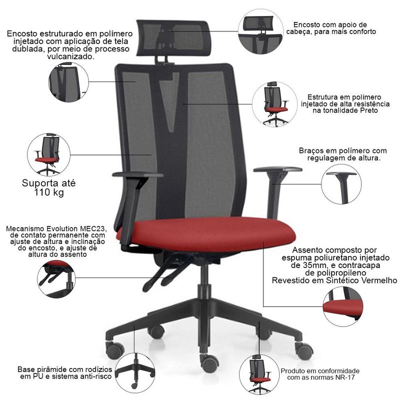 A Cadeira de Escritório Presidente Flow, da Lyam Decor, se destaca como a verdadeira protagonista do conforto e da produtividade. Com um design moderno que une estética e funcionalidade, ela se adapta perfeitamente ao seu estilo, seja no escritório convencional ou no aconchego do home office. Equipada com um mecanismo Evolution, um sistema de contato permanente, essa cadeira giratória abraça as suas necessidades, permitindo ajustes precisos na altura do assento, do encosto e dos braços. Cada detalhe foi pensado para proporcionar um suporte ideal, respeitando o biotipo do usuário e promovendo uma postura saudável durante longas horas de trabalho. Já a base pirâmide, adornada com rodízios em PU e sistema anti-risco, desliza suavemente sobre qualquer superfície, garantindo movimentos ágeis e seguros. Por fim, o encosto com apoio de cabeça completa a experiência, permitindo que você se concentre no que realmente importa, enquanto sua mente flui livremente. Com a cadeira presidente Flow sua jornada laboral será transformada em uma experiência prazerosa e produtiva. Sente-se, ajuste-se e deixe a inspiração fluir! Dimensões da Cadeira (L x A x P) 71 x 111 x 71 cm Medidas Internas: Altura máxima regulável: até 121,5 cm Altura regulável do chão ao assento: 44,5 a 54,5 cm Altura do chão aos braços: 62 a 72,5 cm Assento livre (L x P): 51 x 49 cm Encosto (L x A): 49 x 58 cm Encosto de cabeça (L x A): 29,4 x 13 cm Profundidade total com o encosto reclinado: 80 cm Características: Estrutura em polímero injetado de alta resistência na tonalidade Preta. Assento estofado com espuma injetada em poliuretano de 35mm e contracapa de polipropileno. Revestimento em tecido Sintético de alta qualidade na tonalidade Vermelho. Encosto estruturado em polímero injetado com aplicação de tela dublada, por meio de processo vulcanizado. Mecanismo Evolution MEC23, de contato permanente com ajuste de altura e inclinação do encosto, e ajuste de altura do assento, de acordo com o biotipo do usuário. Braços em polímero com regulagem de altura. Encosto com apoio de cabeça, para mais conforto. Base pirâmide com rodízios em PU e sistema anti-risco. Peso máximo suportado 110 kg, com uso recomendado de 8 horas diária. Produto em conformidade com as normas NR-17. - Por se tratar de estofado as medidas podem ter uma pequena variação de até 3 cm. - A tonalidade do produto real poderá ter ligeira variação devido o lote de tecidos. Observações importantes: - Produto para uso residencial em ambiente interno, não devendo ficar exposto diretamente ao sol, calor e umidade excessivos. - Pode haver alguma diferença de tonalidade entre a imagem e o produto real, por conta do tratamento de imagens e a calibração de cores do seu monitor. - As imagens são meramente ilustrativas, não acompanham objetos de decoração e eletrônicos. - Ao receber a mercadoria, o cliente deve verificar as condições da embalagem, caso haja alguma avaria não assine o comprovante de recebimento e entre em contato com nossa loja para orientações. - Montagem, desmontagem e outras instalações serão de responsabilidade do cliente. Não nos responsabilizamos, no ato da entrega, por subir escadas/elevadores ou pelo transporte por guincho em apartamentos. Eventuais despesas são de responsabilidade do comprador. - Confira as dimensões do produto e certifique-se de que passará normalmente por supostos elevadores, portas, escadas e/ou corredores de sua residência. - Para mais informações, acesse nossa Central de Atendimento.