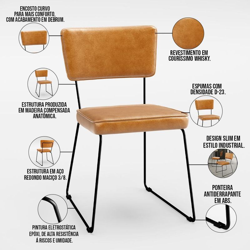 O espetáculo que é a Cadeira Estofada Para Sala De Jantar Base De Aço Allana L02 Couríssimo Whisky - Lyam Decor vem para agregar ainda mais valor na decoração da sua casa. Sua estrutura em aço remete-nos ao estilo industrial que surgiu em Nova York no século XX, já o assento e encosto estofados trazem equilíbrio e conforto criando a combinação perfeita para o ambiente. Podendo ser disposta em salas de jantar e estar, cozinha, espaço gourmet, dentre outras opções, se destaca com muita elegância e presença. Conta com materiais de máxima qualidade e está sempre pronta para recepcionar família e amigos de forma agradável. Você e seu lar merecem, aproveite!! Dimensões da Cadeira (L x A x P) 45 x 76 x 55 cm Medidas Internas: Altura do Assento ao chão: 45 cmLargura do assento: 40 cmProfundidade do assento: 39 cmAltura do assento: 06 cmAltura do encosto: 23 cmLargura do encosto: 39 cmAltura do assento ao encosto: 37 cmLargura traseira dos pés: 37 cm Características:Estrutura em madeira compensada anatômica.Estrutura de aço redondo maciço 3/8 polegadas, com ponteira antiderrapante em abs.Pintura eletrostática epóxi de alta resistência à riscos e umidade, na cor preto.Assento e encosto com espuma D-23 e acabamento em Debrum.Revestimento em Couríssimo Whisky de alta qualidade, com acabamento semi brilho.Peso suportado: Até 100 kg. - Por se tratar de estofado as medidas podem ter uma pequena variação de até 3 cm. - A tonalidade do produto real poderá ter ligeira variação devido o lote de tecidos. - A limpeza deve ser feita com pano levemente umedecido em água limpa, sem esfregar, não utilizar produtos abrasivos, desengordurantes, álcool ou solvente. Observações importantes: - Produto para uso residencial em ambiente interno, não devendo ficar exposto diretamente ao sol, calor e umidade excessivos. - Pode haver alguma diferença de tonalidade entre a imagem e o produto real, por conta do tratamento de imagens e a calibração de cores do seu monitor. - As imagens são meramente ilustrativas, não acompanham objetos de decoração e eletrônicos. - Ao receber a mercadoria, o cliente deve verificar as condições da embalagem, caso haja alguma avaria não assine o comprovante de recebimento. - Montagem, desmontagem e outras instalações serão de responsabilidade do cliente. Não nos responsabilizamos, no ato da entrega, por subir escadas/elevadores ou pelo transporte por guincho em apartamentos. Eventuais despesas são de responsabilidade do comprador. - Confira as dimensões do produto e certifique-se de que passará normalmente por supostos elevadores, portas, escadas e/ou corredores de sua residência.