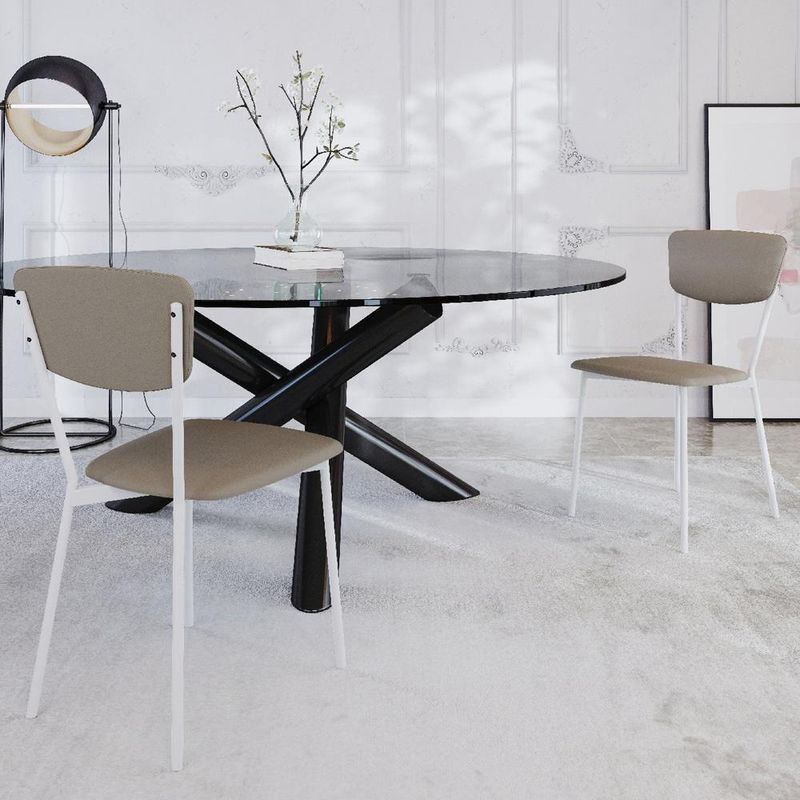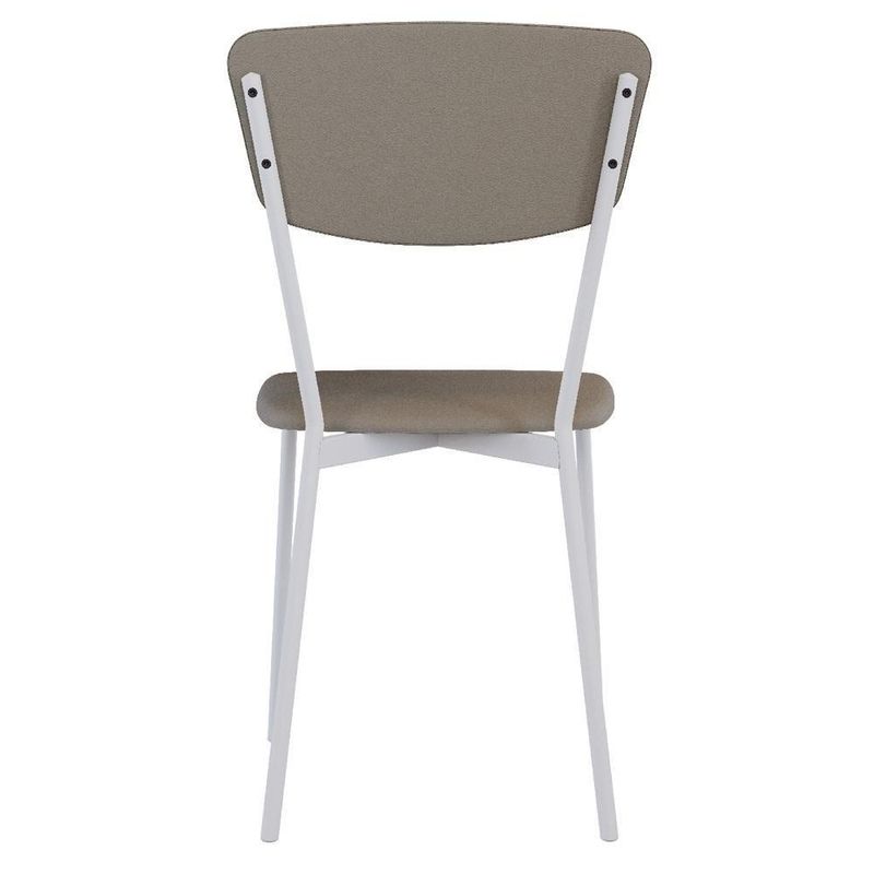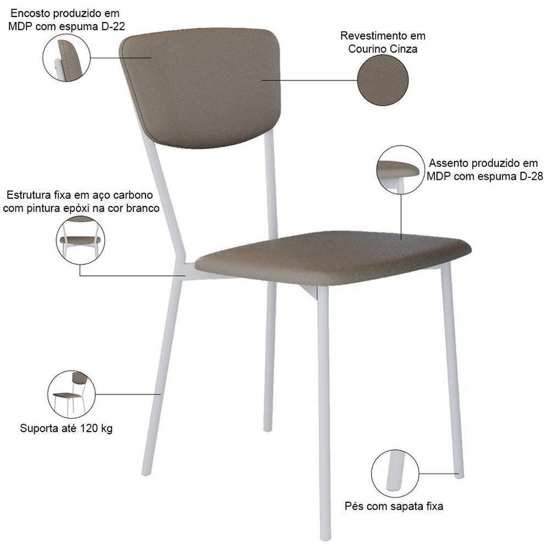 Cadeira Estofada Para Sala De Jantar Village Branco C01 Courino Cinza - Lyam DecorDesfrute de momentos inesquecíveis com a Cadeira Village, projetada para oferecer o máximo de conforto e elegância com seu estilo retrô. Com sua estrutura de aço na tonalidade branco e assento e encosto estofados com materiais de altíssima qualidade, ela proporciona suporte ideal para longas refeições e conversas agradáveis. Além de combinar durabilidade e estilo, ela é a escolha perfeita para quem busca sofisticação e bem-estar em cada detalhe. Transforme sua sala de jantar com a nossa Cadeira Village. Aproveite!Dimensões da Cadeira (L x A x P) 43 x 83 x 53 cmAltura do chão ao assento: 49 cm Largura do encosto: 42 cm Altura do encosto: 23 cmCaracterísticas: Estrutura fixa em aço carbono com pintura epóxi na cor branco. Encosto produzido em MDP com espuma D-22. Assento produzido em MDP com espuma D-28. Revestimento em Courino na cor Cinza. Pés com sapatas fixa. Peso suportado de até 120 kg.- Por se tratar de estofado as medidas podem ter uma pequena variação de até 3 cm. - A tonalidade do produto real poderá ter ligeira variação devido o lote de tecidos. - A limpeza deve ser feita com pano levemente umedecido em água limpa, sem esfregar, não utilizar produtos abrasivos, desengordurantes, álcool ou solvente.Observações importantes: - Produto para uso residencial em ambiente interno, não devendo ficar exposto diretamente ao sol, calor e umidade excessivos. - Pode haver alguma diferença de tonalidade entre a imagem e o produto real, por conta do tratamento de imagens e a calibração de cores do seu monitor. - As imagens são meramente ilustrativas, não acompanham objetos de decoração e eletrônicos. - Ao receber a mercadoria, o cliente deve verificar as condições da embalagem, caso haja alguma avaria não assine o comprovante de recebimento. - Montagem, desmontagem e outras instalações serão de responsabilidade do cliente. Não nos responsabilizamos, no ato da entrega, por subir escadas/elevadores ou pelo transporte por guincho em apartamentos. Eventuais despesas são de responsabilidade do comprador. - Confira as dimensões do produto e certifique-se de que passará normalmente por supostos elevadores, portas, escadas e/ou corredores de sua residência. Model: Village | ProductWeight: 6,5 kg | ProductWidth: 43 cm | ProductWarranty: 90 dias após o recebimento do produto | ProductLength: 53 cm | ProductHeight: 83 cm | Cor: Cinza