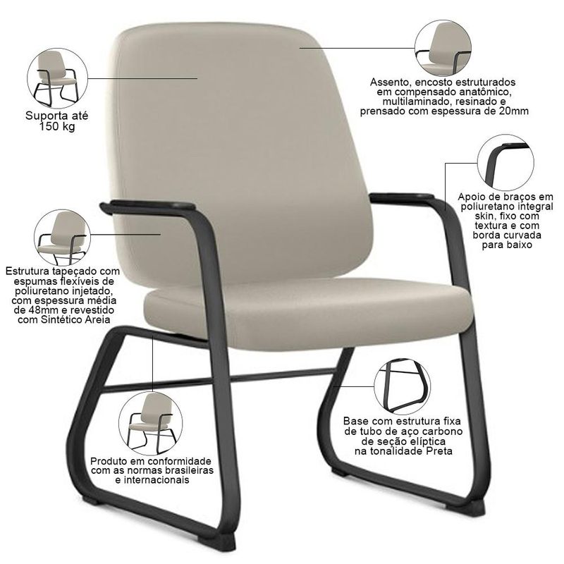 Eleve o status do seu espaço comercial e corporativo com a Cadeira Executiva Diretor Fixa Hub, da Lyam Decor. Desenvolvida para líderes que buscam o melhor, essa cadeira diretor é a fusão perfeita entre design sofisticado e ergonomia impecável. Com estrutura em aço de carbono e espuma de alta densidade, ela oferece o suporte e o conforto que você precisa para alcançar seus objetivos. Além da base sólida e do conforto da tapeçaria, essa cadeira de escritório ainda conta com apoios ergonômicos para os braços, proporcionando um descanso relaxante, ao passo que as linhas elegantes permitem a fácil harmonização com qualquer ambiente profissional. Seja no escritório, home office, recepção ou em uma sala de reuniões, a cadeira executiva transmite a imagem de poder e sucesso que você deseja. Adquira a sua agora mesmo e experimente o que é trabalhar com o máximo de conforto e estilo, além de descobrir um novo nível de produtividade. Dimensões da Cadeira (L x A x P) 68,5 x 102,5 x 73,5 cm Medidas Internas: Altura do encosto: 58 cm Altura do chão ao assento: 46 cm Largura interna entre a base: 60 cm Características: Base com estrutura fixa de tubo de aço carbono de seção elíptica na tonalidade Preta. Assento e encosto estruturados em compensado anatômico, multilaminado, resinado e prensado com espessura de 20mm. Revestimento em tecido Sintético de alta qualidade na tonalidade Areia. Assento e encosto tapeçados com espumas flexíveis de poliuretano injetado, com espessura média de 48mm. Apoio de braços em poliuretano integral skin, fixo com textura e com borda curvada para baixo, para melhor conforto. Peso máximo suportado 150 kg. Produto em conformidade com as normas brasileiras e internacionais. - Por se tratar de estofado as medidas podem ter uma pequena variação de até 3 cm. - A tonalidade do produto real poderá ter ligeira variação devido o lote de tecidos. Observações importantes: - Produto para uso residencial em ambiente interno, não devendo ficar exposto diretamente ao sol, calor e umidade excessivos. - Pode haver alguma diferença de tonalidade entre a imagem e o produto real, por conta do tratamento de imagens e a calibração de cores do seu monitor. - As imagens são meramente ilustrativas, não acompanham objetos de decoração e eletrônicos. - Ao receber a mercadoria, o cliente deve verificar as condições da embalagem, caso haja alguma avaria não assine o comprovante de recebimento e entre em contato com nossa loja para orientações. - Montagem, desmontagem e outras instalações serão de responsabilidade do cliente. Não nos responsabilizamos, no ato da entrega, por subir escadas/elevadores ou pelo transporte por guincho em apartamentos. Eventuais despesas são de responsabilidade do comprador. - Confira as dimensões do produto e certifique-se de que passará normalmente por supostos elevadores, portas, escadas e/ou corredores de sua residência. - Para mais informações, acesse nossa Central de Atendimento.