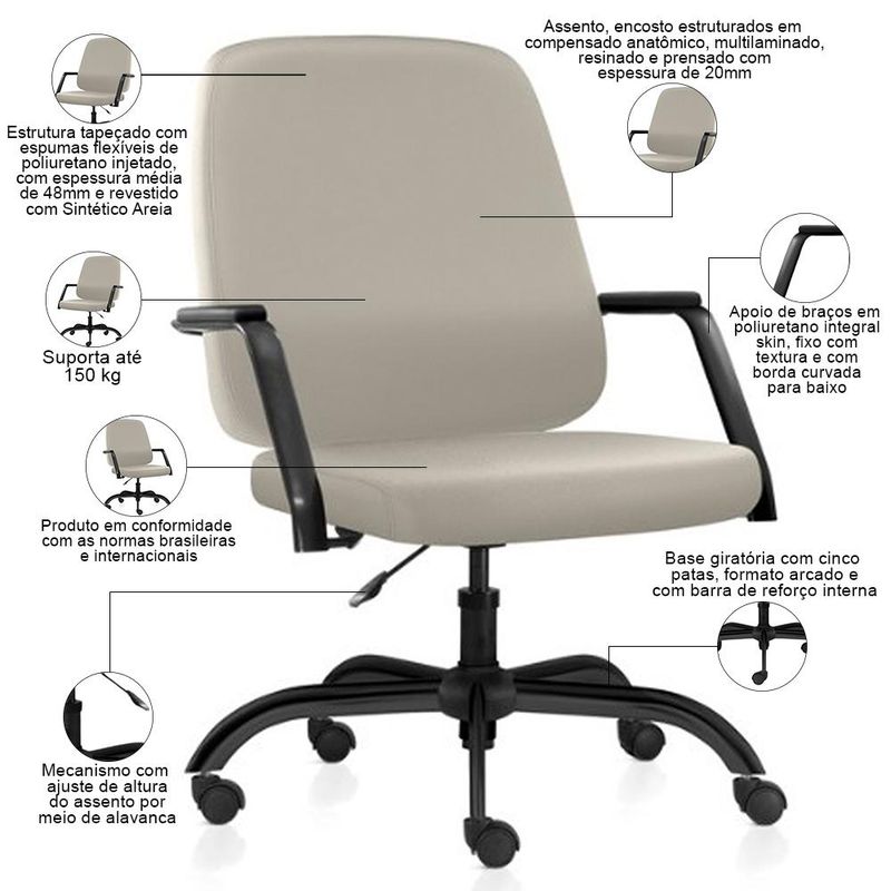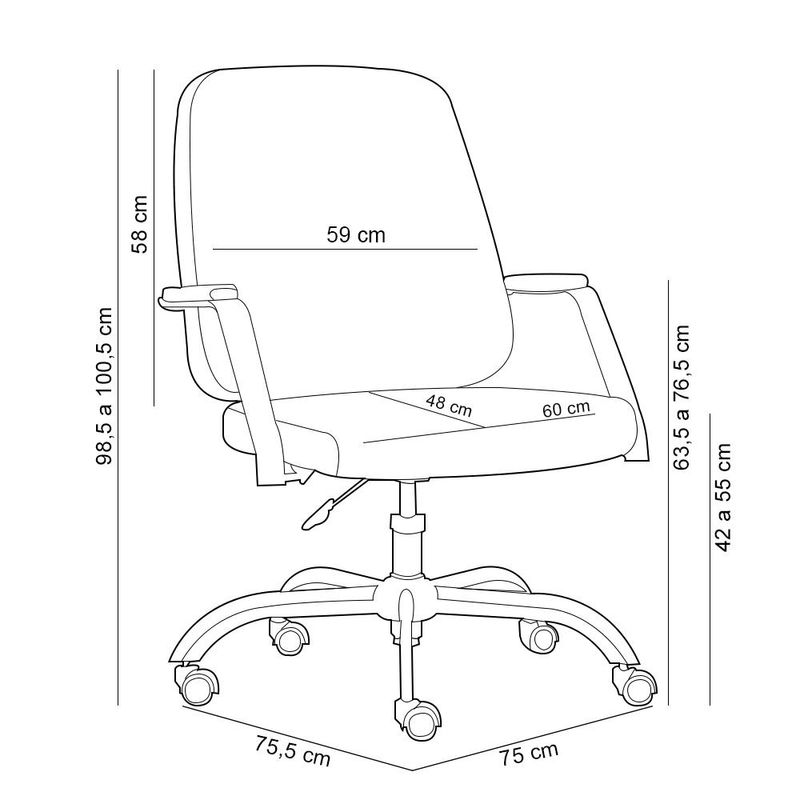 Projetada para proporcionar o máximo de conforto e estilo aos profissionais mais exigentes, a Cadeira Executiva Diretor Giratória Hub, da Lyam Decor, é a escolha perfeita para quem busca aliar funcionalidade e design em um único produto. O assento e encosto anatômicos garantem um ajuste perfeito ao corpo, ao passo que proporcionam suporte e alívio para a coluna, mesmo durante longas jornadas de trabalho. Já a base giratória oferece maior estabilidade e segurança, permitindo que você se movimente livremente pela sua área de trabalho, para uma rotina mais dinâmica. Por fim, o design contemporâneo, com linhas modernas e elegantes, se adaptam a qualquer ambiente corporativo, complementando a decoração do seu escritório. Crie um ambiente moderno e funcional com essa cadeira giratória e sinta o aumento da produtividade ao trabalhar em uma cadeira de escritório confortável. Adquira já a sua e aproveite! Dimensões da Cadeira (L x A x P) 75 x 98,5 x 75,5 cm Medidas Internas: Encosto (L x A): 59 x 58 cm Assento L x P): 60 x 48 cm Altura total ajustável: de 98,5 a 100,5 cm Altura ajustável do chão ao assento: de 42 a 55 cm Altura ajustável do chão ao braço: de 63,5 a 76,5 cm Características: Assento e encosto estruturados em compensado anatômico, multilaminado, resinado e prensado com espessura de 20mm e tapeçados com espumas flexíveis de poliuretano injetado, com espessura média de 48mm. Revestimento em tecido Sintético de alta qualidade na cor Areia. Base giratória com cinco patas, formato arcado e com barra de reforço interna. Mecanismo com ajuste de altura do assento, por meio de alavanca. Apoio de braços em poliuretano integral skin, fixo com textura e com borda curvada para baixo, para melhor conforto. Peso máximo suportado 150 kg. Produto em conformidade com as normas brasileiras e internacionais. - Por se tratar de estofado as medidas podem ter uma pequena variação de até 3 cm. - A tonalidade do produto real poderá ter ligeira variação devido o lote de tecidos. Observações importantes: - Produto para uso residencial em ambiente interno, não devendo ficar exposto diretamente ao sol, calor e umidade excessivos. - Pode haver alguma diferença de tonalidade entre a imagem e o produto real, por conta do tratamento de imagens e a calibração de cores do seu monitor. - As imagens são meramente ilustrativas, não acompanham objetos de decoração e eletrônicos. - Ao receber a mercadoria, o cliente deve verificar as condições da embalagem, caso haja alguma avaria não assine o comprovante de recebimento e entre em contato com nossa loja para orientações. - Montagem, desmontagem e outras instalações serão de responsabilidade do cliente. Não nos responsabilizamos, no ato da entrega, por subir escadas/elevadores ou pelo transporte por guincho em apartamentos. Eventuais despesas são de responsabilidade do comprador. - Confira as dimensões do produto e certifique-se de que passará normalmente por supostos elevadores, portas, escadas e/ou corredores de sua residência. - Para mais informações, acesse nossa Central de Atendimento.
