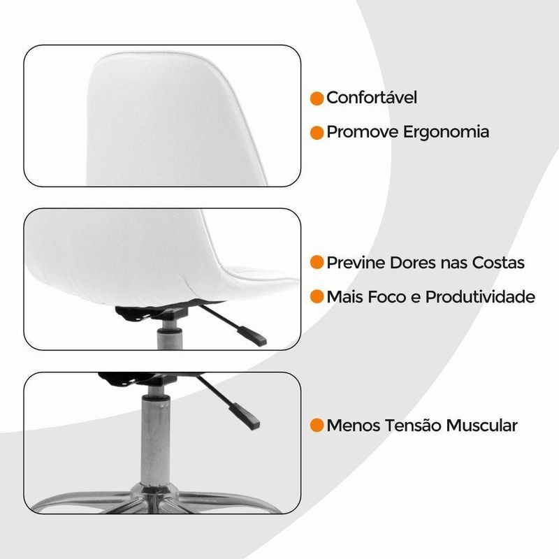 Cadeira Giratória Office Eiffel Botonê Oficial BrancoCadeira Office Eiffel Botonê Ajustável com Base Giratória – Design, Conforto e Versatilidade para o Seu EspaçoDescubra o equilíbrio ideal entre estilo moderno e conforto ergonômico com a Cadeira Office Eiffel Botonê Ajustável com Base Giratória.Desenvolvida para oferecer elegância e funcionalidade, ela é perfeita para escritórios, home offices, salas de estudo, áreas de lazer e ambientes comerciais.Seu design contemporâneo com estofamento botonê traz um toque sofisticado à decoração, enquanto o assento anatômico e o encosto ergonômico garantem conforto e postura correta mesmo durante longos períodos de uso.Com ajuste de altura e base giratória com rodízios, a Cadeira Eiffel Botonê proporciona mobilidade suave e personalização de uso, adaptando-se facilmente às suas necessidades diárias com praticidade e estilo.A montagem é simples e rápida — acompanha manual de instruções e suporte de atendimento especializado para qualquer dúvida. Diferenciais do ProdutoDesign Sofisticado e Ergonômico: Estilo botonê moderno com curvas anatômicas que garantem conforto e elegância.Ajuste de Altura Personalizado: Permite adaptar a cadeira ao seu biotipo e à altura da mesa.Base Giratória com Rodízios Cromados: Mobilidade fluida e estabilidade em qualquer superfície.Estrutura Resistente e Durável: Produzida em polipropileno (PP) e aço cromado de alta qualidade.Revestimento Premium: Material sintético (PU) de toque suave e fácil limpeza.Versatilidade de Uso: Ideal para ambientes corporativos e residenciais.Montagem Simples: Acompanha manual e suporte pós-venda especializado.Extras: acompanha e-book exclusivo. Especificações TécnicasModelo: Eiffel BotonêMarca: Oficial WebshopTipo de Cadeira: Office / GiratóriaMaterial da Estrutura: Polipropileno (PP) e Aço CromadoRevestimento: Material Sintético (PU)Assento e Encosto: Madeira multilaminada com acabamento botonêBase: Giratória com rodízios e regulagem de alturaPeso Máximo Suportado: 120 kgPeso da Cadeira: 5,5 kg Dimensões do ProdutoAltura Total (mín./máx.): 84,5 cm a 98 cmAltura do Assento (mín./máx.): 44,5 cm a 58 cmAltura do Encosto: 68 cmLargura do Assento: 43 cmProfundidade do Assento: 41 cmLargura da Base (pernas): 47,5 cmEspessura do Encosto: 5 cm Cuidados e ManutençãoLimpe com pano úmido e detergente neutro, evitando produtos abrasivos que possam danificar o acabamento.Evite exposição direta ao sol para preservar a cor, o brilho e a durabilidade do revestimento e da base cromada. Conforto e Estilo em Cada Detalhe!A Cadeira Office Eiffel Botonê Ajustável com Base Giratória combina ergonomia, resistência e elegância em um único design.Ideal para quem busca um ambiente funcional e sofisticado, ela transforma o seu espaço em um local mais confortável, moderno e inspirador.