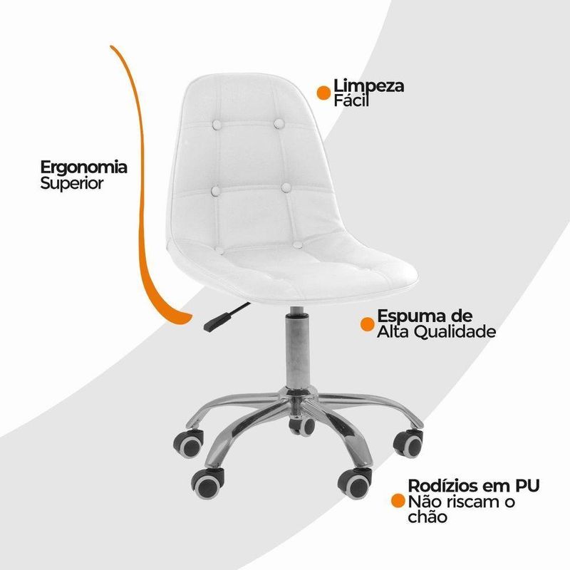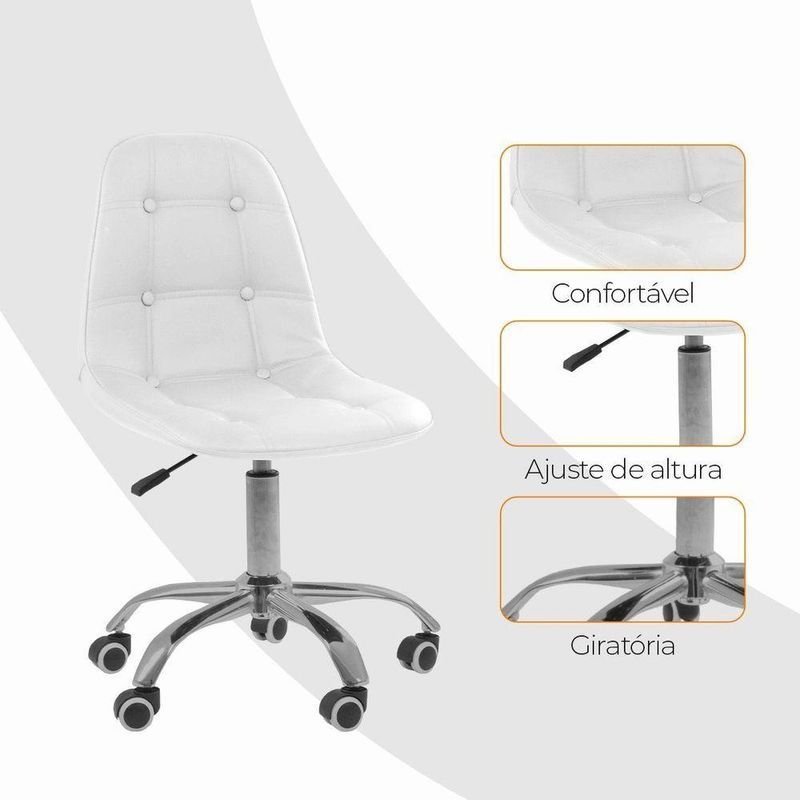 Cadeira Giratória Office Eiffel Botonê Oficial BrancoCadeira Office Eiffel Botonê Ajustável com Base Giratória – Design, Conforto e Versatilidade para o Seu EspaçoDescubra o equilíbrio ideal entre estilo moderno e conforto ergonômico com a Cadeira Office Eiffel Botonê Ajustável com Base Giratória.Desenvolvida para oferecer elegância e funcionalidade, ela é perfeita para escritórios, home offices, salas de estudo, áreas de lazer e ambientes comerciais.Seu design contemporâneo com estofamento botonê traz um toque sofisticado à decoração, enquanto o assento anatômico e o encosto ergonômico garantem conforto e postura correta mesmo durante longos períodos de uso.Com ajuste de altura e base giratória com rodízios, a Cadeira Eiffel Botonê proporciona mobilidade suave e personalização de uso, adaptando-se facilmente às suas necessidades diárias com praticidade e estilo.A montagem é simples e rápida — acompanha manual de instruções e suporte de atendimento especializado para qualquer dúvida. Diferenciais do ProdutoDesign Sofisticado e Ergonômico: Estilo botonê moderno com curvas anatômicas que garantem conforto e elegância.Ajuste de Altura Personalizado: Permite adaptar a cadeira ao seu biotipo e à altura da mesa.Base Giratória com Rodízios Cromados: Mobilidade fluida e estabilidade em qualquer superfície.Estrutura Resistente e Durável: Produzida em polipropileno (PP) e aço cromado de alta qualidade.Revestimento Premium: Material sintético (PU) de toque suave e fácil limpeza.Versatilidade de Uso: Ideal para ambientes corporativos e residenciais.Montagem Simples: Acompanha manual e suporte pós-venda especializado.Extras: acompanha e-book exclusivo. Especificações TécnicasModelo: Eiffel BotonêMarca: Oficial WebshopTipo de Cadeira: Office / GiratóriaMaterial da Estrutura: Polipropileno (PP) e Aço CromadoRevestimento: Material Sintético (PU)Assento e Encosto: Madeira multilaminada com acabamento botonêBase: Giratória com rodízios e regulagem de alturaPeso Máximo Suportado: 120 kgPeso da Cadeira: 5,5 kg Dimensões do ProdutoAltura Total (mín./máx.): 84,5 cm a 98 cmAltura do Assento (mín./máx.): 44,5 cm a 58 cmAltura do Encosto: 68 cmLargura do Assento: 43 cmProfundidade do Assento: 41 cmLargura da Base (pernas): 47,5 cmEspessura do Encosto: 5 cm Cuidados e ManutençãoLimpe com pano úmido e detergente neutro, evitando produtos abrasivos que possam danificar o acabamento.Evite exposição direta ao sol para preservar a cor, o brilho e a durabilidade do revestimento e da base cromada. Conforto e Estilo em Cada Detalhe!A Cadeira Office Eiffel Botonê Ajustável com Base Giratória combina ergonomia, resistência e elegância em um único design.Ideal para quem busca um ambiente funcional e sofisticado, ela transforma o seu espaço em um local mais confortável, moderno e inspirador.