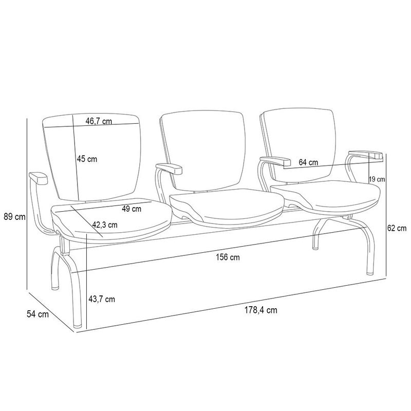A Cadeira Longarina 3 Lugares , é uma opção robusta e elegante para uma recepção confortável. Essa cadeira combina elementos de design moderno e materiais duráveis para oferecer suporte ergonômico e resistência ao uso diário. O encosto baixo e assento estofado são características importantes dessa cadeira, pois fornecem apoio e conforto adicional para a região lombar e ajudam a manter uma postura correta proporcionando maior conforto aos seus usuários, é uma escolha funcional e esteticamente agradável para um ambiente de espera. Com seu design ergonômico, materiais resistentes e conforto adicional, essa cadeira oferece suporte adequado e durabilidade ideais para consultórios, escritórios, recepções, espaços de atendimento ao público e aeroportos, além de seus pés com pontas antiderrapantes para proporcionar o máximo conforto e bem estar aos seus visitantes. Adquira já mais conforto para seus locais de recepção! Dimensões do produto (L x A x P) 178 cm x 89 cm x 54 cm Medidas internas: Profundidade assento: 45 cm Largura assento: 49 cm Altura encosto: 41 cm Altura do chão ao assento: 48 cm Largura do encosto: 44 cm Características: Cadeira longarina, encosto com estrutura injetada em termoplástico. Assento em madeira compensada e estofado em espuma flexível, de alta qualidade. Apoio fixo em termoplástico ergonomicamente confortável. Revestimento em Vinil na cor Azul. Estrutura em Aço de Carbono com pintura eletrostática na cor preto. Pés com ponteiras em Polipropileno, para proteção do piso. Possui certificado de NR-17. Suporta até 110 kg. - Por se tratar de estofado as medidas podem ter uma pequena variação de até 3 cm. - A tonalidade do produto real poderá ter ligeira variação devido o lote de tecidos. Observações importantes: - A montagem será de responsabilidade do comprador; - Responsabilizamo-nos pela entrega em todo território nacional, até onde as rodovias alcançam, entregas fluviais ou aéreas devem ser cotadas a parte; - Não nos responsabilizamos, no ato da entrega, por subir escadas/elevadores ou transporte por guincho em apartamentos. - Eventuais despesas são de responsabilidade do comprador; - Confira as dimensões do produto e certifique-se de que passará normalmente por supostos elevadores, portas, escadas e/ou corredores de sua residência;
