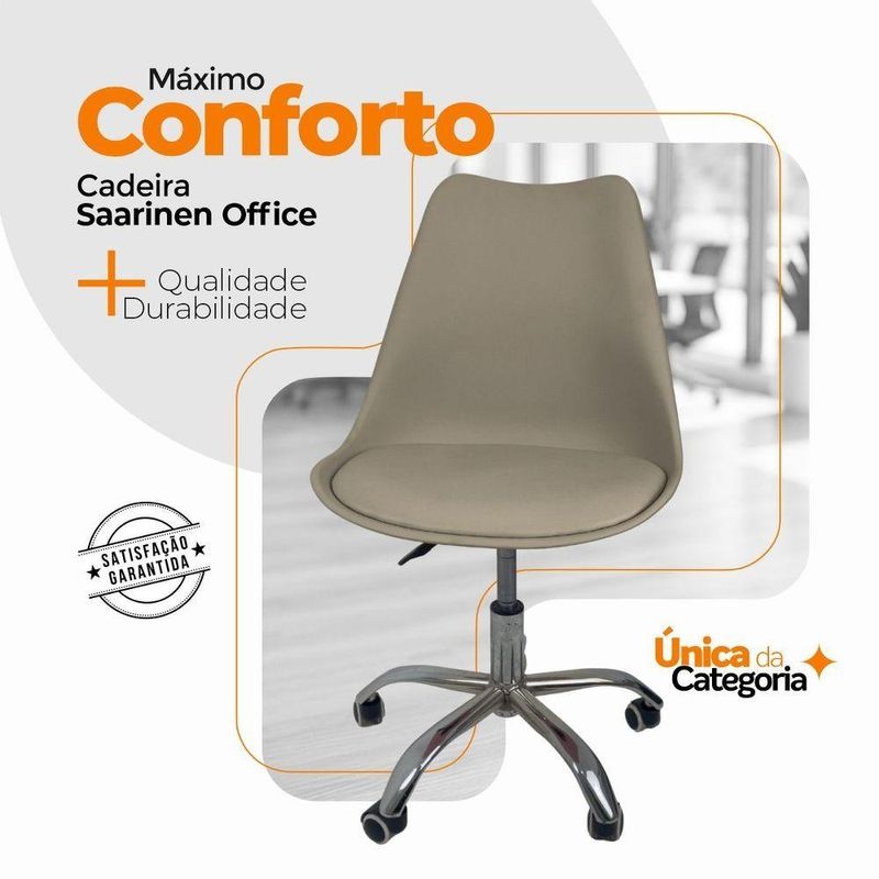 Cadeira Office Base Cromada Com Rodízio Giratória Saarinen Bege 1Cadeira Office Saarinen Base Cromada com Rodízios – Conforto, Design Moderno e VersatilidadeA Cadeira Office Saarinen Base Cromada com Rodízio Giratório é ideal para quem busca um móvel que una estilo, conforto e funcionalidade. Seu design contemporâneo se adapta perfeitamente a diversos ambientes, como escritório, home office, sala de jantar ou quarto, garantindo elegância e praticidade no dia a dia.Medidas do Produto:Altura Total: 83 a 96 cmAltura do Assento ao Chão: 47 a 60 cmAltura do Encosto: 48 cmLargura:- Pernas: 30 cm- Assento: 48 cm- Encosto: 48 cmComprimento:- Encosto: 2 cm- Assento: 41 cmPeso: 6 kgPeso Máximo Suportado: 120 kgMateriais- Revestimento em couro sintético (PU), resistente e fácil de limpar- Assento em madeira multilaminada, oferecendo firmeza e durabilidade- Base cromada com rodízios, garantindo mobilidade e estabilidadeDiferencialAcompanha E-book exclusivo!