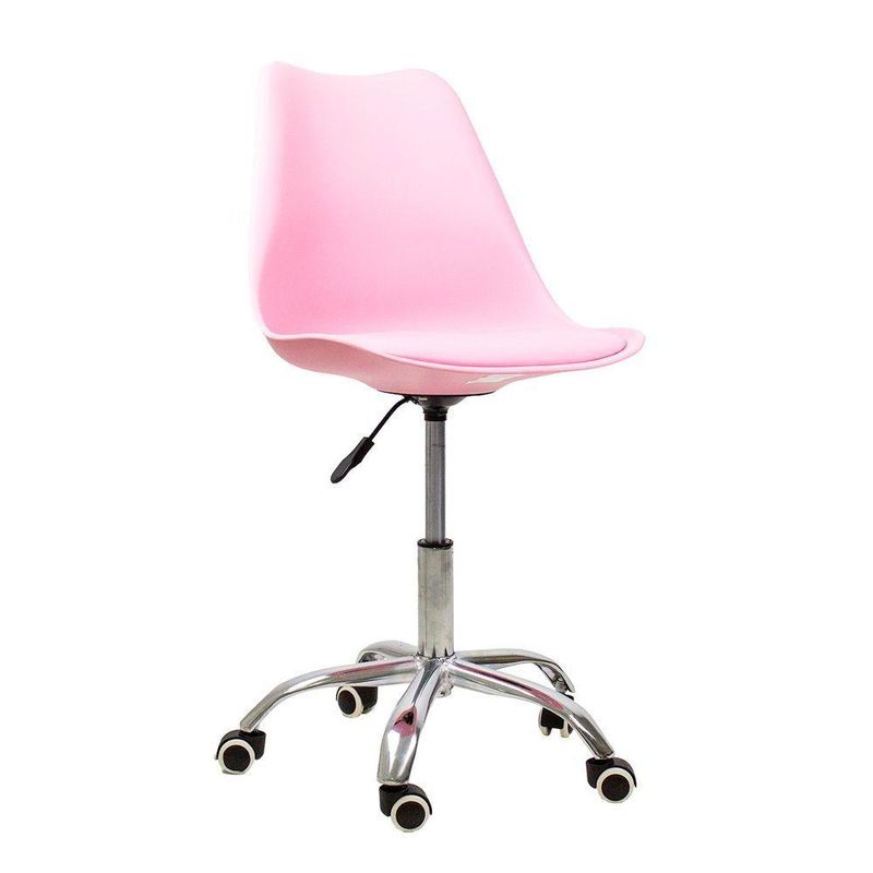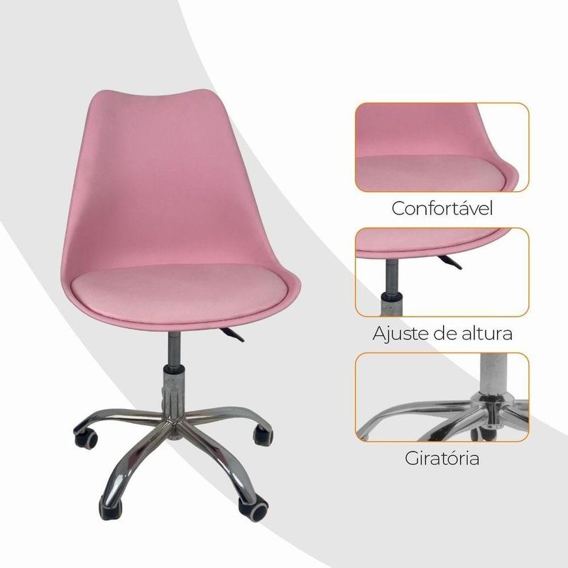 Cadeira Office Oficial Cromada Rodízio Giratór Saarinen RosaCadeira Office Saarinen Base Cromada com Rodízios – Conforto, Design Moderno e VersatilidadeA Cadeira Office Saarinen Base Cromada com Rodízio Giratório é ideal para quem busca um móvel que una estilo, conforto e funcionalidade. Seu design contemporâneo se adapta perfeitamente a diversos ambientes, como escritório, home office, sala de jantar ou quarto, garantindo elegância e praticidade no dia a dia.Medidas do Produto:Altura Total: 83 a 96 cmAltura do Assento ao Chão: 47 a 60 cmAltura do Encosto: 48 cmLargura:- Pernas: 30 cm- Assento: 48 cm- Encosto: 48 cmComprimento:- Encosto: 2 cm- Assento: 41 cmPeso: 6 kgPeso Máximo Suportado: 120 kgMateriais- Revestimento em couro sintético (PU), resistente e fácil de limpar- Assento em madeira multilaminada, oferecendo firmeza e durabilidade- Base cromada com rodízios, garantindo mobilidade e estabilidadeDiferencialAcompanha E-book exclusivo!