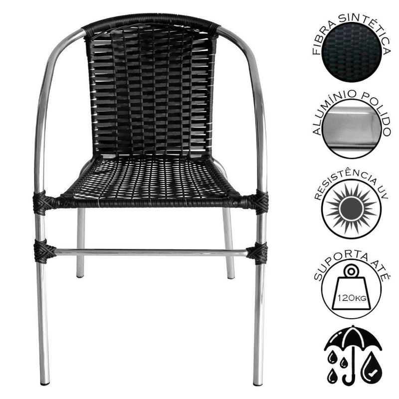Cadeira Pool Alumínio Fibra Sintética Gourmet Acesse Móveis PretoCadeira Pool em aluminio com assento e encosto em fibra sintetica anti-UV.Leve, resistente e elegante, e ideal para areas com piscina, areas gourmet, varandas, jardins, resorts, hoteis e espacos de lazer, combinando conforto e design moderno em qualquer ambiente externo.Sua estrutura em aluminio garante resistencia a ferrugem e a maresia, enquanto a fibra sintetica com protecao UV mantem o tom e a integridade mesmo sob sol e chuva.Alem disso, sao empilhaveis, facilitando a organizacao e economizando espaco.Indicacao de uso: area gourmet, piscina, varanda, jardim, hoteis e resortsCaracteristicas:Estrutura em aluminio, leve, resistente e nao enferrujaAcabamento em fibra sintetica anti-UV, ideal para ambientes externosEmpilhavel, pratica para armazenar e organizarVai montada, pronta para usoSuporta ate 120 kgItens Inclusos:01 Cadeira Pool Aluminio Fibra Sintetica para Area GourmetDimensoes:Altura: 75 cmAltura ate o assento: 45 cmLargura: 52 cmProfundidade: 60 cmPeso: 3 kgGarantia de 3 Meses contra defeitos de fabricacao.