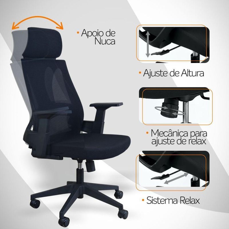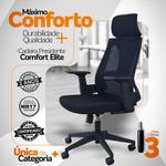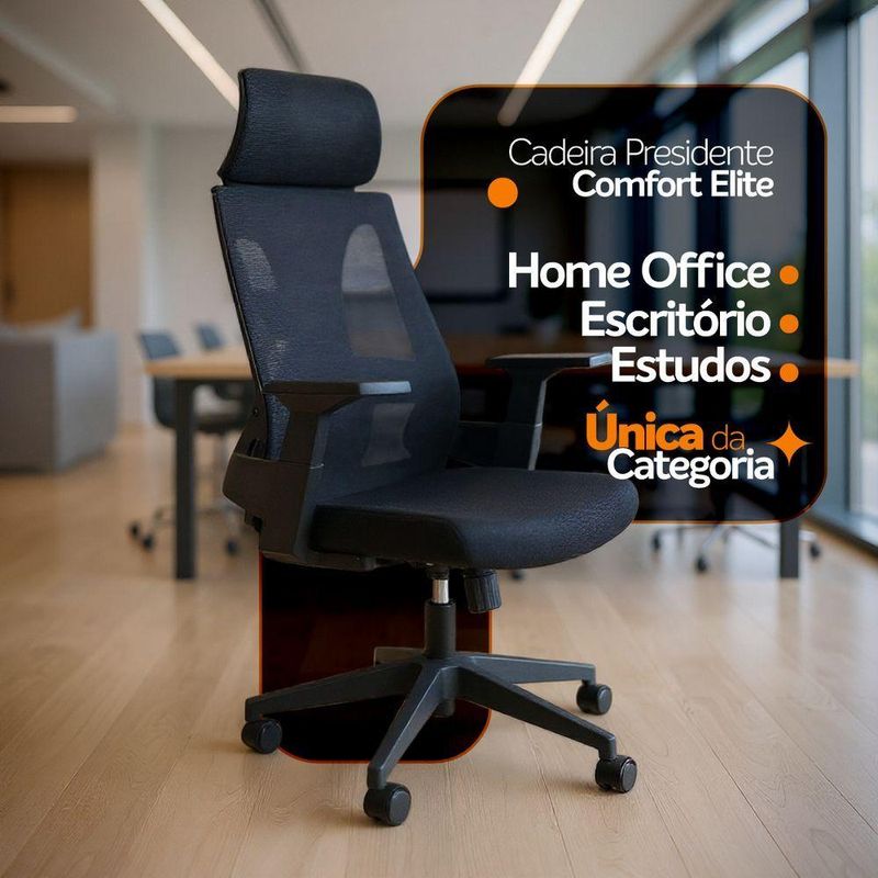 Cadeira Presidente Oficial Comfort EliteCadeira Presidente Oficial Comfort Elite com Apoio de CabeçaConforto robusto, estrutura resistente e design executivo.A Comfort Elite é a escolha ideal para quem valoriza ergonomia, firmeza e qualidade nos mínimos detalhes. Com estrutura reforçada, assento de alta densidade e apoio de cabeça amplo, é perfeita para quem passa longos períodos trabalhando ou estudando.A inclinação sincronizada é um mecanismo presente em cadeiras e poltronas que permite ao usuário ajustar o encosto e o assento de forma simultânea, proporcionando maior conforto e ergonomia durante o uso. Esse tipo de reclinação é comumente encontrado em móveis de escritório, especialmente em cadeiras de trabalho, onde a postura correta é essencial para evitar dores e lesões musculares.O encosto é revestido em tecido Mesh Premium, composto por 64% de poli elastômero e 36% de poliéster. Já o assento conta com espuma 35D, revestida em tecido 100% poliéster.Atende aos requisitos da NR-17 além disso possui o cobiçado selo BIFMA de qualidade, garantindo durabilidade e desempenho excepcionais.Garantia de 2 anos!Destaques do Produto:Encosto de cabeça fixo revestido por mesh para acompanhar o design do encostoEstrutura do encosto em PP virgem com fibra, resistente e durável.Apoio lombar em PP preto, fixo, oferecendo suporte constante à coluna. Apoios de braço modelo T, integrados em PP preto. Assento com espuma de alta densidade (D45), conforto firme e duradouro. Placa de eucalipto multilaminada (10 camadas – 12 mm), de alta dureza. Mecanismo butterfly 2,5 mm com trava de posição. Pistão a gás nitrurado #85, curso de 40 mm, para ajuste suave de altura. Base resistente em PP preto Ø 320 mm. Rodízios de nylon Ø 50 mm, com movimentação leve e silenciosa. Dimensões Aproximadas:Altura total: 95 a 105 cm Altura do assento ao chão: 44 a 53 cm Largura entre braços: 63 cm Largura do assento: 52 cm Profundidade do assento: 52 cm Altura dos braços: 21 cm Altura do encosto: 20 cm Largura do encosto: 36 cm Distância entre os pés: 62 cm A Comfort Elite combina resistência, funcionalidade e elegância em uma cadeira ideal para home office ou ambientes corporativos.Desempenho diário com conforto profissional. Escolha a Comfort Elite.Atende todos os padrões de ergonomia NR-17, além disso possui o cobiçado selo BIFMA de qualidade, garantindo durabilidade e desempenho excepcionais.