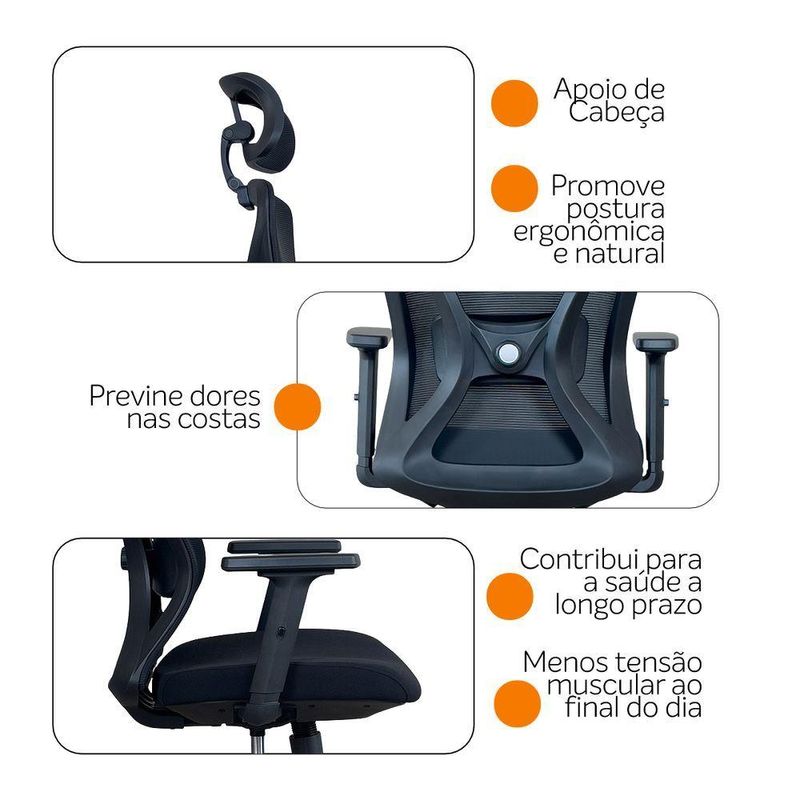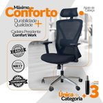 Cadeira Presidente Oficial Comfort Work Com ApoioCadeira Presidente Oficial Comfort WorkErgonomia profissional, ajustes inteligentes e estrutura premium.A Comfort Work foi desenvolvida para quem passa longas horas em frente ao computador e precisa de uma cadeira que ofereça conforto real, suporte completo e alta durabilidade. Com múltiplos ajustes, estrutura reforçada e design executivo, ela é perfeita para ambientes corporativos.A inclinação sincronizada é um mecanismo presente em cadeiras e poltronas que permite ao usuário ajustar o encosto e o assento de forma simultânea, proporcionando maior conforto e ergonomia durante o uso. Esse tipo de reclinação é comumente encontrado em móveis de escritório, especialmente em cadeiras de trabalho, onde a postura correta é essencial para evitar dores e lesões musculares.O encosto é revestido em tecido Mesh Premium, composto por 64% de poli elastômero e 36% de poliéster. Já o assento conta com espuma 35D, revestida em tecido 100% poliéster.Atende aos requisitos da NR-17 além disso possui o cobiçado selo BIFMA de qualidade, garantindo durabilidade e desempenho excepcionais.Garantia de 2 anos!Destaques do Produto:Apoio de cabeça 3D, funcional, moldado em peça única de PP com fibra, ajustável em inclinação e altura.Encosto com armação traseira em PP com fibra de vidro, aprovado no teste de tração BIFMA (136 kg), com malha elástica respirável de alta qualidade. Apoio lombar 3D ajustável em altura e profundidade, oferecendo suporte personalizado à região lombar. Braços com regulagem 2D (altura), promovendo conforto e postura adequada. Assento com espuma moldada de densidade média e alta resiliência, oferecendo equilíbrio entre maciez e sustentação. Base com trava de posição e mecanismo de balanço livre, para mais liberdade de movimento. Pistão a gás de 3 estágios, curso de 100 mm, em acabamento preto. Estrutura da base em tubos quadrados eletroplated Ø 350 mm, resistente e elegante. Rodízios em PU Ø 60 mm, silenciosos e ideais para diferentes tipos de piso. Dimensões Aproximadas:Altura total: 104 a 113 cm Altura do assento ao chão: 41 a 51 cm Largura entre braços: 66 cm Altura dos braços: 18 a 27 cm Largura do assento: 52 cm Profundidade do assento: 51 cm Distância entre os pés: 67 cm Largura do encosto (com apoio): 33 cm Altura do encosto (com apoio): 17 cm Com estrutura profissional, materiais de alta performance e ajustes ergonômicos, a Comfort Work oferece mais conforto, produtividade e qualidade de vida no seu dia a dia.Seu trabalho merece mais conforto. Escolha a Comfort Work.