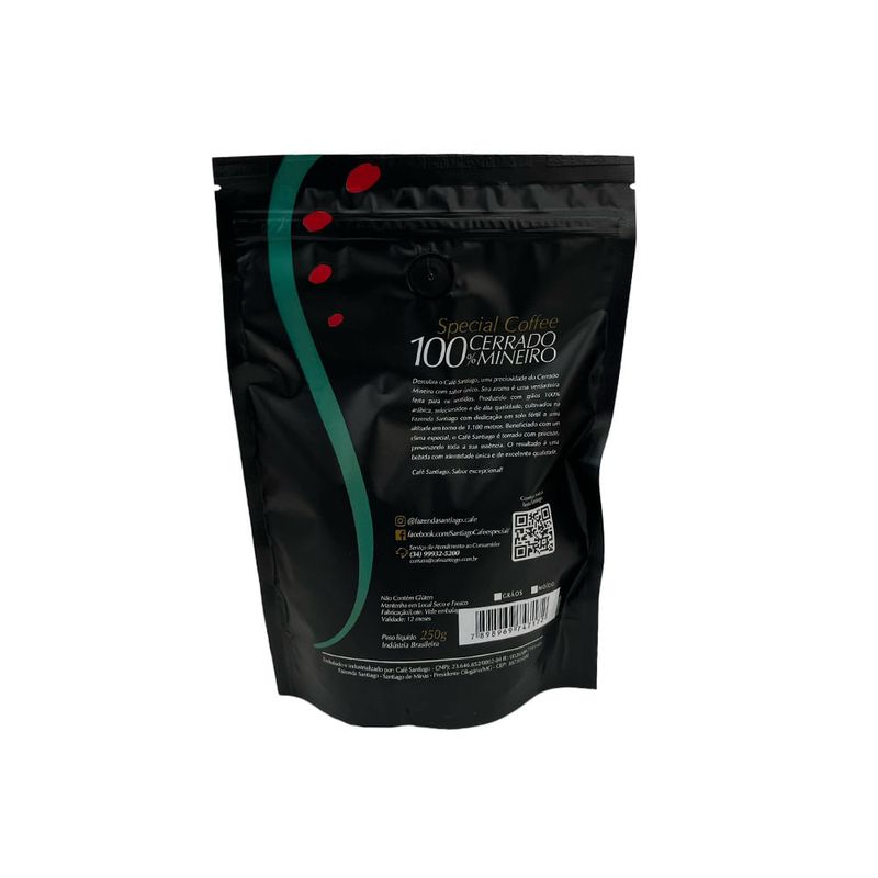 Santiago é um café cuidadosamente produzido a partir de grãos 100% arábica, selecionados e de alta qualidade. Esses grãos são cultivados na Fazenda Santiago, situada a uma altitude entre 950 e 1.100 metros, resultando em um café de identidade única e excelente qualidade. Os grãos desta seleção, da variedade Bourbon Vermelho e apresentam notas sensoriais de chocolate 70% e rapadura. Sobre a Fazenda Santiago: Nos anos 70, Elmiro Nascimento herdou a fazenda Santiago em Presidente Olegário, MG, e inicialmente se concentrou na produção de leite, tornando-se um grande produtor na região. Nos anos 90, seguindo o conselho de seu amigo vizinho, começou a cultivar café gradualmente, substituindo a produção de leite. A fazenda atende às normas de exportação e possui certificação Rainforest, UTZ, Starbucks C.A.F.E Practices e Certifica Minas.
