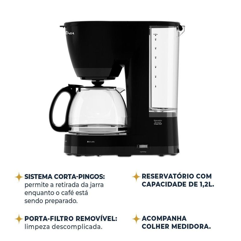 A Cafeteira BCF32C Jarra de Vidro da Britânia é perfeita para quem ama café fresquinho em grande quantidade. Com capacidade para 32 xícaras, ela garante praticidade e sabor para todos os momentos.Seu reservatório de água de 1,2L permite preparar mais café de uma só vez, enquanto o sistema corta-pingos evita sujeira ao retirar a jarra antes do término do preparo. Além disso, a base de aquecimento mantém o café quente por mais tempo, ideal para reuniões ou família grande.Com design sofisticado em preto fosco e detalhes brilhantes, a Cafeteira Britânia une beleza e funcionalidade. Possui jarra de vidro resistente, reservatório removível para facilitar o enchimento e potência de 800W para um preparo rápido e eficiente.Que tal combinar essa cafeteira com um super conjunto de xícaras? Aproveite agora mesmo!