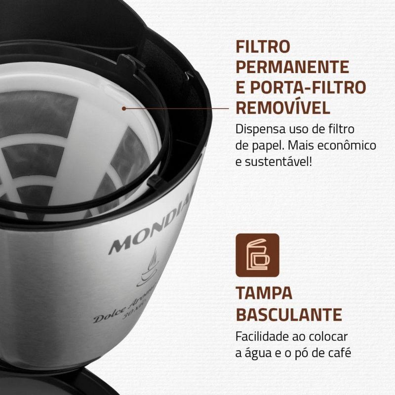 Cafeteira Elétrica Mondial Dolce Arome C-37ji-30x 800w Preto/inox 220 VA Cafeteira Eletrica Dolce Arome C-37-JI-30X pode preparar ate 30 xicaras de cafe com muita praticidade. Possui filtro permanente e porta filtro removivel que proporcionam mais sustentabilidade ao meio ambiente. Moderna, a jarra em inox e mais duravel, facil de lavar e pode ser levada a mesa. Conta com sistema corta pingos e base com aquecimento para conservar a temperatura do cafe por mais tempo.MODELO: C37JI30 xicaras de cafe: Perfeita para atender a familiaDesign sofisticado: Acabamento em aco inox que proporciona mais elegancia a sua cozinhaFiltro Permanente e porta filtro removivel: Dispensa a utilizacao do filtro de papel, proporcionando mais economia e sustentabilidadeSistema corta pingos: Permite a retirada da jarra para servir o cafe durante o preparoJarra em inox: Nao quebra, e facil de lavar e pratica para levar a mesaBase com aquecimento: Conserva a temperatura do cafePotencia: 800WDimensoes do produto:Altura: 32 cmLargura: 20 cmProfundidade: 27,5 cmPeso: 1,300 kg