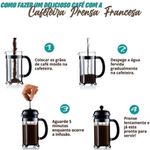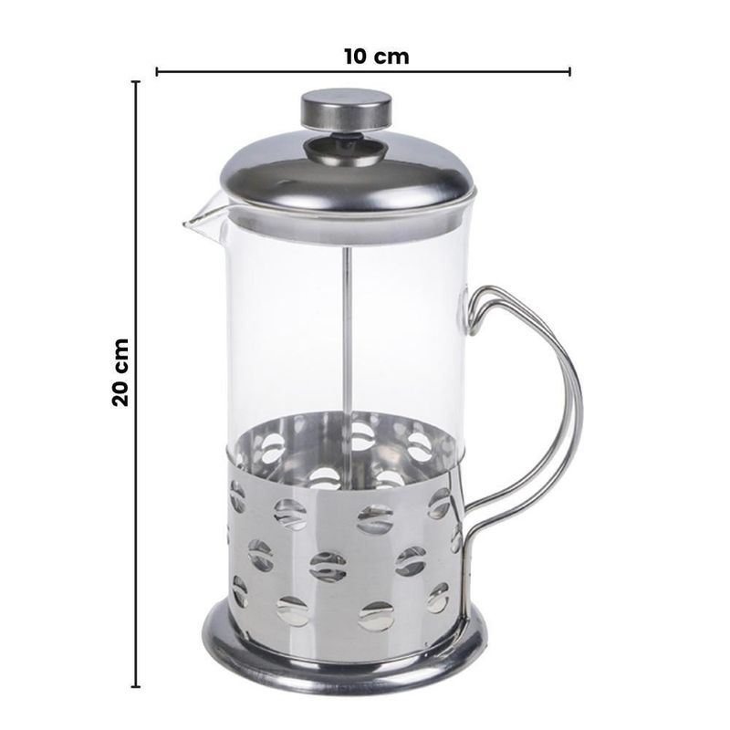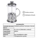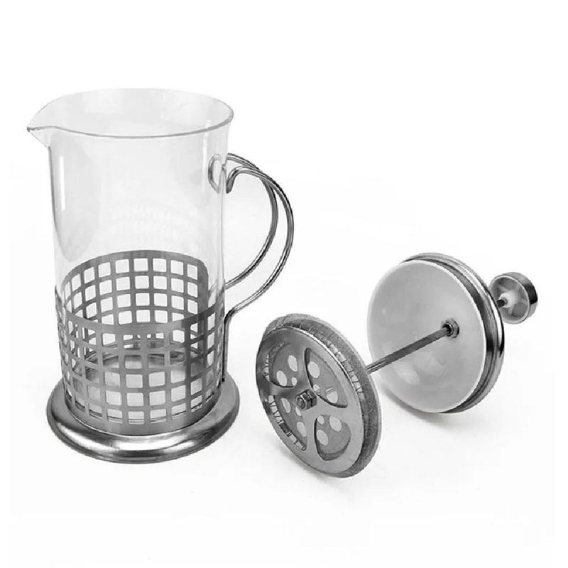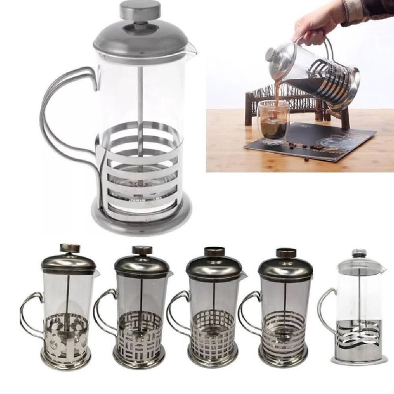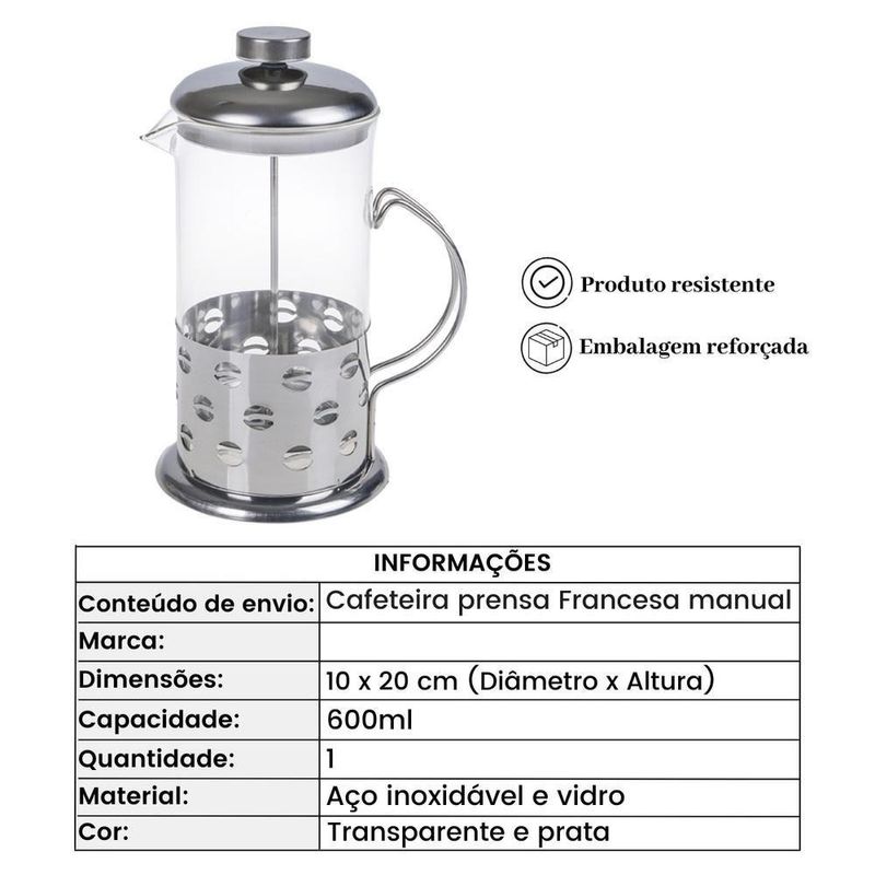 Cafeteira Francesa Em Inox Luxo 600ml Praticidade E Elegância Para Seu CaféCafeteira Francesa - Experiência GourmetA Cafeteira Francesa é um dos métodos mais populares de preparo do café expresso, oferecendo uma experiência autêntica e rica. Sua versatilidade é uma grande vantagem: leve e prática, ela dispensa o uso de energia elétrica, possibilitando o preparo do expresso em qualquer lugar, seja em um piquenique, acampamento ou até mesmo no escritório.Para obter um ótimo café, recomendamos utilizar grãos recém-moídos, maximizando o aroma e sabor. Além de preparar um café perfeito, a Cafeteira Francesa também é ideal para fazer chás, tornando-se um item multifuncional indispensável.Detalhes do Produto:Material: Estrutura em aço inox, corpo de vidro boro silicato.Capacidade: 600 ml.Peso Líquido: 500 g.Design Sofisticado: Elegante e decorativo, enviado aleatoriamente.Praticidade: Leve, fácil de transportar e usar.Base de Silicone: Proporciona estabilidade e .Filtros Incluídos: Contém 1 conjunto de filtros para um preparo perfeito.Benefícios para Você:Sabor Autêntico: Desfrute de um café com sabor marcante e autêntico.Versatilidade: Ideal para preparar café e chás, em qualquer lugar.Praticidade: Sem necessidade de energia elétrica, fácil de transportar.Design Elegante: Adicione um toque de sofisticação à sua cozinha.Material Durável: Feito em aço inox e vidro resistente.Incluso no Pacote:01 Cafeteira Francesa 600 ml.Transforme seu momento do café em uma experiência gourmet com a Cafeteira Francesa. Adquira já a sua e leve a qualidade do café expresso para qualquer lugar!Cafeteira Francesa - Experiência Gourmet A Cafeteira Francesa é um dos métodos mais populares de preparo do café expresso, oferecendo uma experiência autêntica e rica. Sua versatilidade é uma grande vantagem: leve e prática, ela dispensa o uso de energia elétrica, possibilitando o preparo do expresso em qualquer lugar, seja em um piquenique, acampamento ou até mesmo no escritório.Para obter um ótimo café, recomendamos utilizar grãos recém-moídos, maximizando o aroma e sabor. Além de preparar um café perfeito, a Cafeteira Francesa também é ideal para fazer chás, tornando-se um item multifuncional indispensável.Detalhes do Produto:Material: Estrutura em aço inox, corpo de vidro boro silicato.Capacidade: 600 ml.Peso Líquido: 500 g.Design Sofisticado: Elegante e decorativo, enviado aleatoriamente.Praticidade: Leve, fácil de transportar e usar.Base de Silicone: Proporciona estabilidade e .Filtros Incluídos: Contém 1 conjunto de filtros para um preparo perfeito. Benefícios para Você:Sabor Autêntico: Desfrute de um café com sabor marcante e autêntico.Versatilidade: Ideal para preparar café e chás, em qualquer lugar.Praticidade: Sem necessidade de energia elétrica, fácil de transportar.Design Elegante: Adicione um toque de sofisticação à sua cozinha.Material Durável: Feito em aço inox e vidro resistente. Incluso no Pacote:01 Cafeteira Francesa 600 ml.Transforme seu momento do café em uma experiência gourmet com a Cafeteira Francesa. Adquira já a sua e leve a qualidade do café expresso para qualquer lugar!