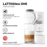 19 Bars, Café em Cápsulas, 1 Litro de Capacidade, prepara 08 xícarasA Lattissima One foi pensada para que você desfrute deliciosas receitas com leite, como Cappuccino e Latte Macchiato no conforto de sua casa, com a praticidade que você precisa para o seu momento único com café. Possui um sistema inteligente para preparo da espuma de leite cremosa que leva a simplicidade à um novo patamar. Basta completar o reservatório de leite com a quantidade que deseja em sua bebida, pois a máquina prepara automaticamente o leite cremoso na medida exata e extrai o café na sequência, tudo com apenas um botão. Fácil de limpar, o reservatório de leite pode ser lavado também na máquina de lavar louças. Além disso é a primeira solução de leite extremamente compacta, perfeita para sua cozinha, com design moderno e a praticidade que você precisa para o dia a dia. CaracterísticasTipo: Espresso AutomáticaTipo de Café: CápsulaCapacidade do Reservatório: 01 litroPressão: 19 BarsQuantidade de Xícaras: 08Tipos de bebidas: CaféSistema Corta Pingos Bandeja para Resíduos Trava na Tampa Indicador do nível de água Reservatório Removível Desligamento Automático Luz Indicadora de Funcionamento Seletor de Quantidade de Café Tempo de Preparo: 1-2 MinMaterial: Plástico Especificações TécnicasModelo: F121-BR-WH-NE (110V) / F121-BR3-WH-NE (220V)Cor: BrancoPotência: 1300W (110V) / 1350W (220V)Voltagem: 110V ou 220V (Não é Bivolt)EAN: 7630477884655 (110V) / 7630477884631 (220V)Garantia: 12 meses Dimensões e PesoDimensões do Produto (AxLxP): 256x154x324 mmPeso do Produto: 4,20 kgItens Inclusos01 Cafeteira New Lattissima One01 Kit de Cápsulas para Degustação