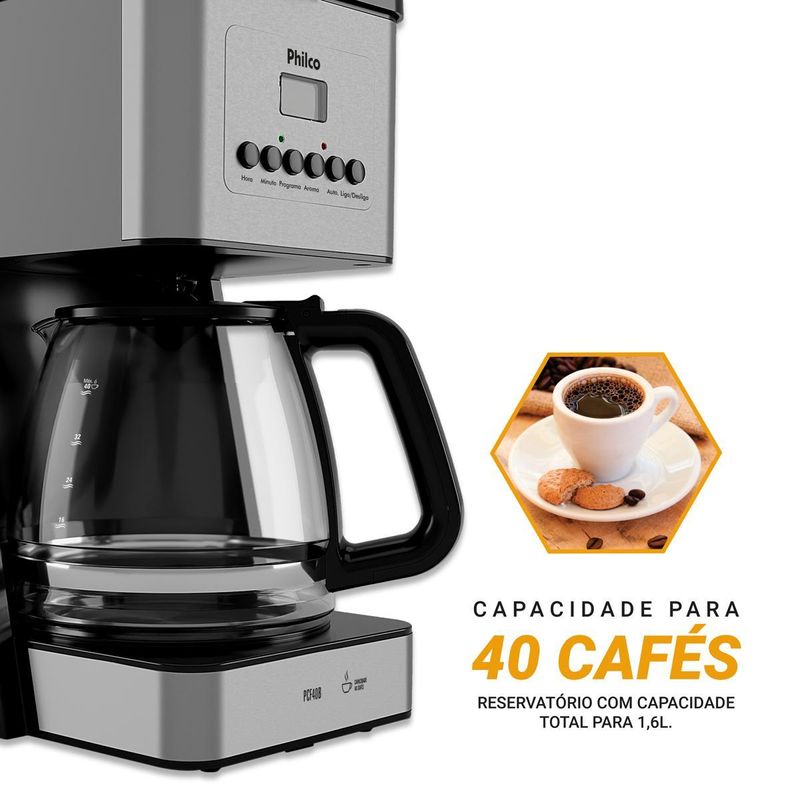 Comece seu dia com um café bem quentinho e saboroso! A Cafeteira Philco 40 Cafezinhos 1000W Painel Digital PCF40B é ideal, pois além de prática e fácil, conta com diversas funções para deixar seu café do jeitinho que você mais gosta. A qualquer hora do dia, a Cafeteira Philco PCF40B, prepara até 40 cafezinhos. O reservatório possui capacidade de 1,6L, perfeita para preparar a quantidade que preferir. Conta com painel digital, que facilita ainda mais o preparo, sendo possível programar o preparo em até 24h de antecedência. Tenha mais comodidade! A Cafeteira PCF40B possui placa de aquecimento, que mantém o café quente, sem alterar o sabor. E o sistema corta-pingo permite a retirada da jarra durante o preparo, interrompendo o fluxo, sem desperdícios e sujeira. No quesito limpeza, a Cafeteira também é eficiente. Conta com filtro permanente e porta-filtro removível, que dispensa o uso de filtro de papel, facilitando a limpeza e diminuindo os gastos. Tudo isso para que possa aproveitar seu café da melhor maneira possível e a qualquer momento do dia. Afinal, tem facilidades que só a Philco faz para você! • Capacidade para 40 cafés • Painel com display digital • Display com relógio integrado • Programa o preparo do café em até 24h de antecedência • Função Aroma, para deixar o café mais intenso • Capacidade do reservatório: 1,6L • Reservatório de água com graduação • Acompanha colher dosadora • Detalhes em inox • Prática jarra de vidro, pode ser levada à mesa • Filtro permanente e porta filtro removível • Placa de aquecimento, mantém o café aquecido após o preparo • Sistema corta-pingos • Botão luminoso liga/desliga.