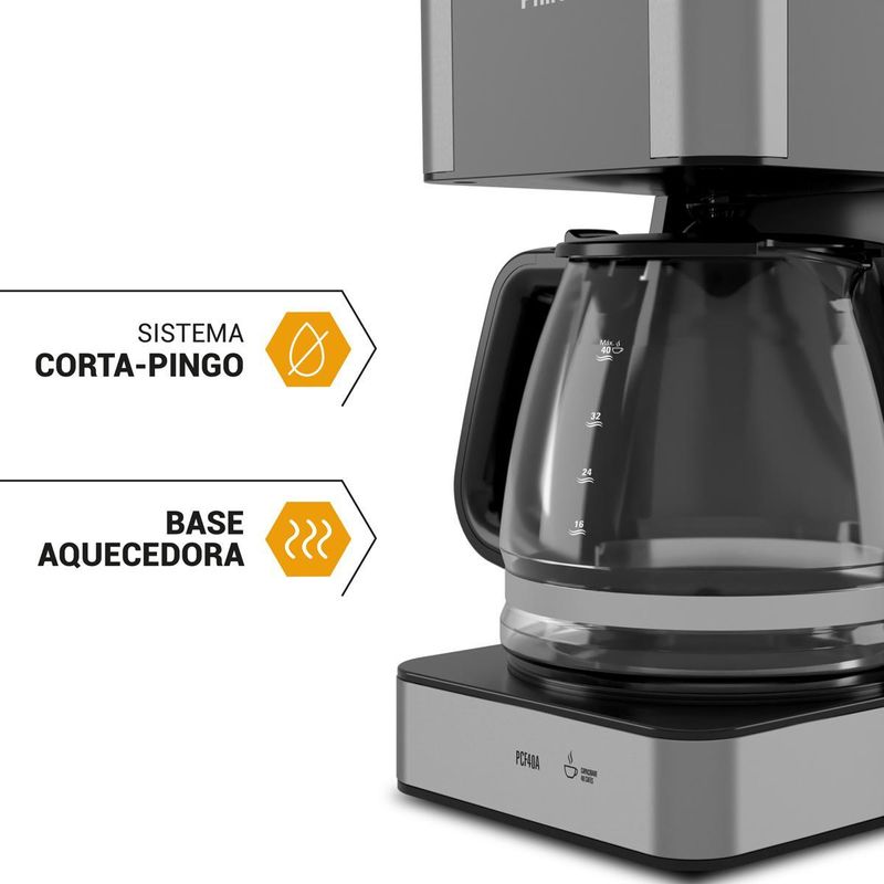 Nada como começar o dia com um delicioso café, não é mesmo? Para isso, conte com a Cafeteira Philco PCF40A 40 Cafezinhos. Com jarra de vidro prática e elegante, pode ser levada a mesa. É perfeita para preparar até 40 cafezinhos de forma prática. Equipada com sistema corta pingo, permite que seja servido o café durante o preparo, interrompendo o fluxo do café sem desperdício. Além disso, a Cafeteira é eficiente e ecológica, pois possui porta filtro removível, dispensando o uso de filtro de papel, além de facilitar na hora da limpeza. Acompanha colher dosadora para que você acerte na quantidade necessária para o seu café e placa de aquecimento que mantém o café aquecido sem alterar o sabor. O melhor café feito por você com a ajuda da Cafeteira Philco PCF40A 40 Cafezinhos! • 40 cafezinhos • Filtro de café removível • Porta filtro removível • Sistema corta pingos • Capacidade do reservatório de 1,5L • Luz indicadora de funcionamento • Indicadores de nível de água.