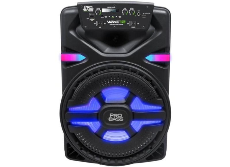 Caixa amplificada bluetooth/sd/usb iluminação de led 12 400w wave12 Características:Caixa de som ativaPotência: 400w rmsWoofer 12com iluminação rítmica ledBateria interna recarregávelEntradas auxiliar: bluetooth, usb,micro sd, microfoneEfeito de echoFunção recRodas para transporteAcompanha 1 microfone com cabo.
