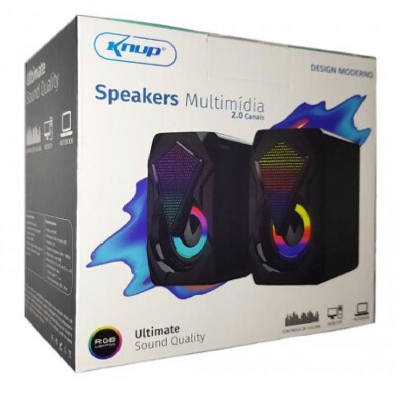 Mini Caixa de Som Multimídia RGB 6W Usb P2 KNUP - KP-R0800Características- Marca: Knup- Compatível com PCs, Notebooks, Smartphones, Tablets, MP3/MP4- Led indicador de funcionamento- Controle de Volume- Potência: 6W - Plug and PlayEspecificações- Potência: 6W RMS (3W x 2)- Alimentação: 5Vdc (via porta USB)- Conexão: P2 de 3.5mm- Frequência de Resposta: 100Hz ~ 20KHz- Sensibilidade: 70dB + 4dB- Impedância: 4 Ohms
