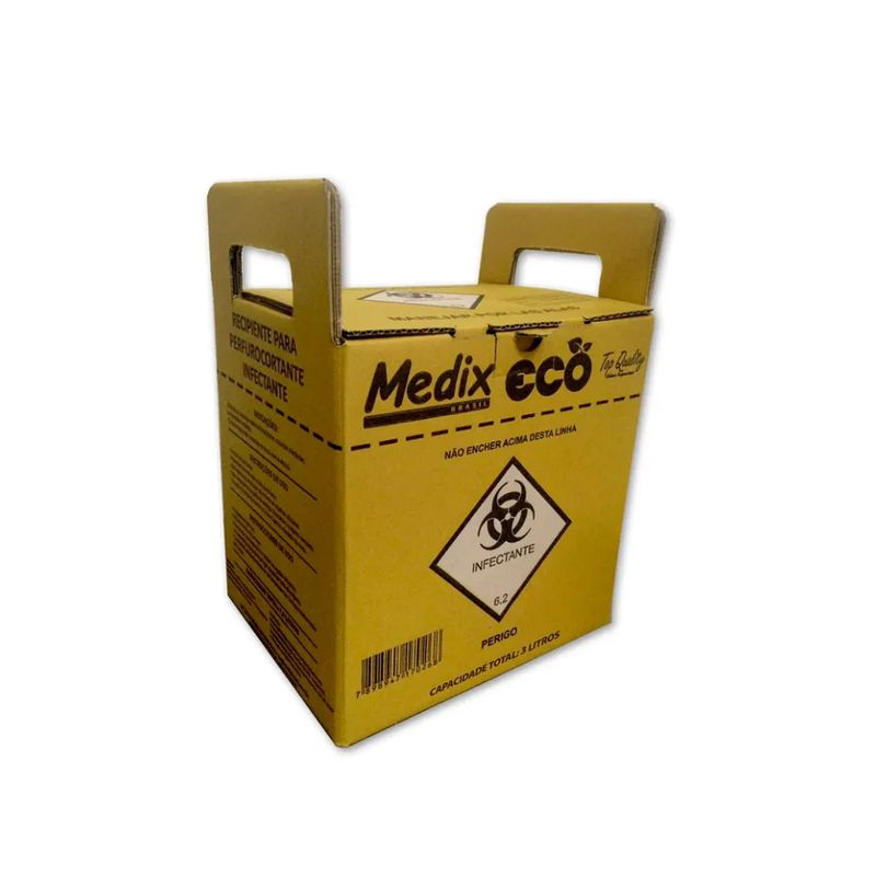 Caixa Coletor de Material Perfuro Cortante Sustentável Medix Recipiente para perfurocortante/infectante, desenvolvido para coleta, armazenamento e descarte de material perfurocortante potencialmente infectante. Previne acidentes e contaminações. Modo de Uso Não proceder da utilização sem antes verificar a inviolabilidade da embalagem; O coletor vem dobrado com os itens de montagem dentro dele; Retire os itens de dentro do coletor; Separe a cinta, o saco amarelo, a bandeja e o fundo; Monte o coletor; Dobre as abas do fundo do coletor até travar; Dobre as abas da parte de cima do coletor; Dobre os lugares marcados na cinta, deixe-a em triângulo; Dobre as marcações da bandeja, coloque o fundo dentro do saco; Coloque a cinta dentro do saco e o saco com cinta e fundo dentro do coletor; Abra a cinta, coloque a bandeja, dobre as alças, tampe o coletor; Após encher o coletor até a linha pontilhada, faça o duplo fechamento e descarte em local apropriado. Proteja do calor, umidade e da luz. Produto descartável e de uso único. Proibido reprocessar. Especificações técnicas Não estéril; Cor: amarelo; Descartável e de uso único; Material e composição: Coletor (papelão ondulado); Sacola de revestimento (polietileno); Fundo (papelão rígido); Cinta interna (papelão rígido); Bandeja interna (papelão ondulado). Validade: 5 anos. Embalagem: Caixa com 20 unidades. Tamanhos e dimensões:- 3L: 43,7x23x27,8cm- 7L: 21,5x17x22cm- 13L: 28,5x20,5x24cm- 20L medida: 305x245x310 Peso embalagem: 3L: 3,8kg; 7L: 6,2kg; 13L: 8,8kg; 20L: 12,4kg.