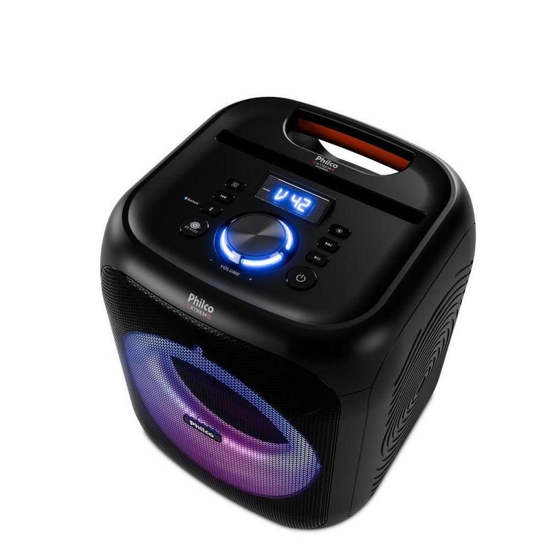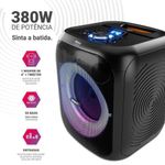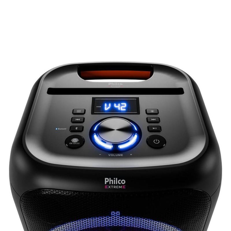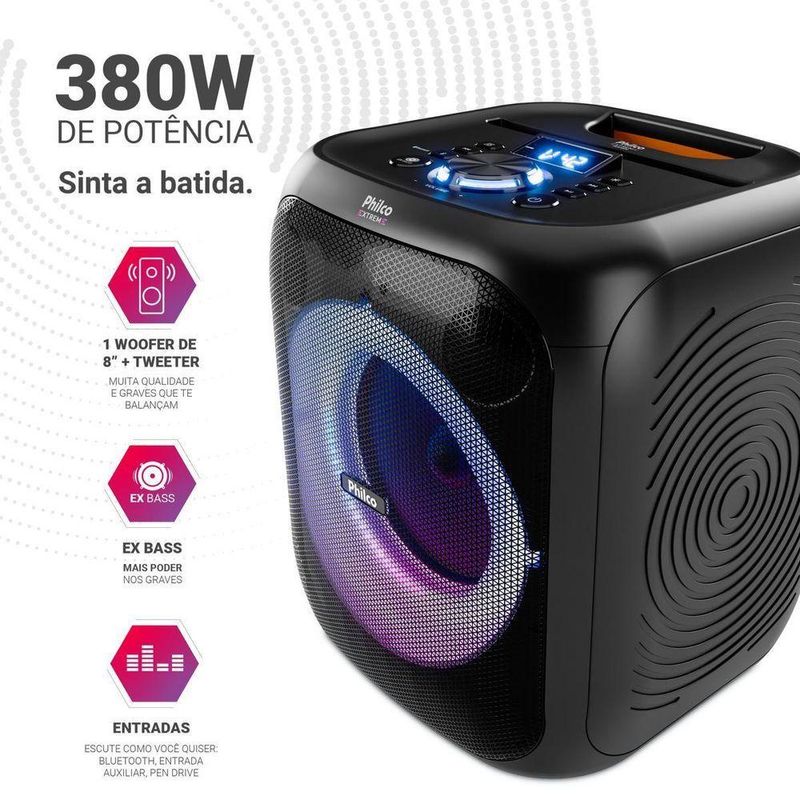 Caixa de Som Amplificada 380W Flash Lights Philco PCX4800 BivoltA Caixa de Som Amplificada Philco deixa suas confraternizações ainda melhores graças ao Flash Lights, sistema de luzes com diferentes modos de iluminação. Som de qualidade por muito mais tempo! A bateria interna recarregável tem duração de até 8h, com alto desempenho e muito mais tempo de utilização. A potência de 380W da Caixa de Som Philco permite que alcance uma excelente performance em qualquer ambiente. Através da conexão Bluetooth 5.3, você conectar seu dispositivo móvel com alto poder de resposta e estabilidade. Melhore sua experiência com a melhor conectividade! Conta ainda com função TWS, que possibilita a conexão com duas Caixas de Som PCX4800 sem a utilização de fio, aumentando ainda mais a potência e diversão nas suas festas. E o melhor? Possui IPX-5, que protege contra jatos de água de baixa pressão. E não para por aí! A Caixa de Som Amplificada Philco PCX4800 tem Bluetooth, entrada auxiliar para fone e microfone e USB! Da batida eletrônica aos acordes calmos de um piano, conte com a Caixa de Som Amplificada 380W Flash Lights Philco PCX4800! - Potência 380W- Bluetooth 5.3- Woofer 8 “ e Tweeter- Tweeter- Flash light- Entrada de Alimentação AC 127V/220V- Bateria Interna de Li-Ion 7,4V 2000mAh- USB: Entrada USB para reprodução de músicas.- Entrada auxiliar de áudio P2- Entrada para microfone- Função TWS- LED indicador de bateria- Função EX Bass- Proteção IPX5- Autonomia de 8h com volume em 50% e luzes desligadasEspecificações Técnicas:Marca: PhilcoModos Flash Lights: SimModelo: PCX4800Potência (W): 380WAutonomia (horas): Até 8 horasConexões: Entrada Auxiliar Microfone USBQuantidade de Alto Falantes: 1Quantidade de Tweeters: 1Altura do produto: 34,6 cmLargura do produto: 29,7 cmComprimento do produto: 30,2 cmPeso do produto: 6,45 kgAltura com embalagem: 42,5 cmLargura com embalagem: 35 cmComprimento com embalagem: 35 cmPeso com embalagem: 7,6 kgAcessórios: Manual de instrução, cabo de alimentação 127V/220VHomologação Anatel: 227882308583Garantia (Dias): 360Observação: Somente faturamos para o nosso consumidor final, ou seja, não faturamos pedidos para CNPJ por este portal de vendas;
