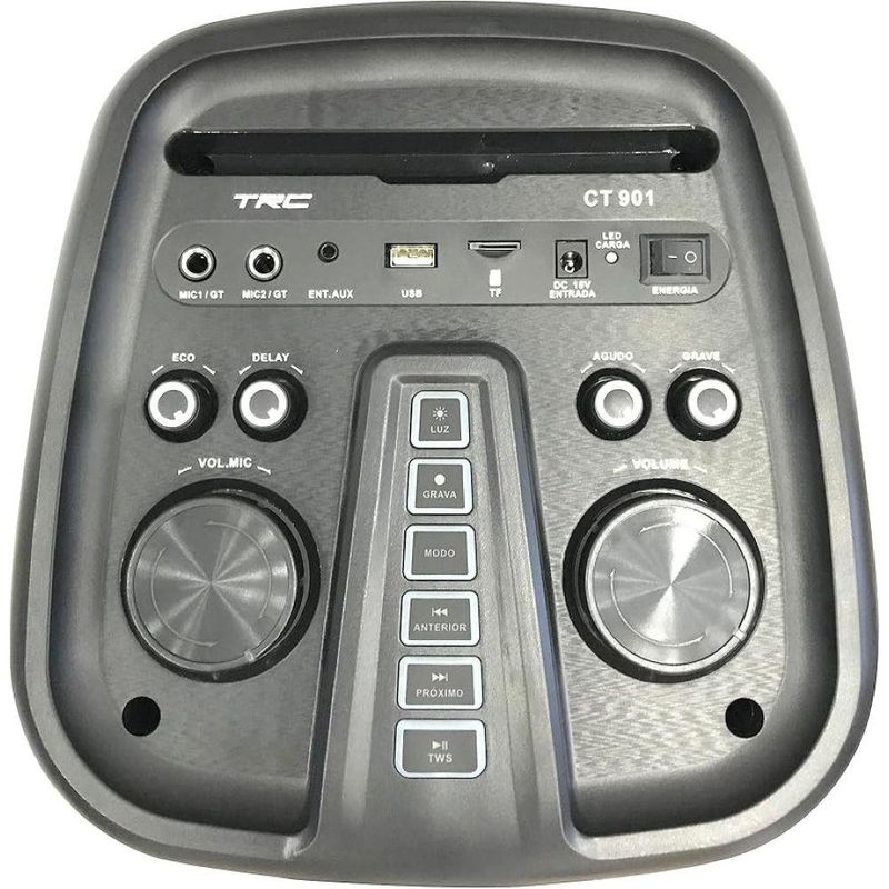 Seja bem-vindo(a) a Loja NIVALMIX Transforme qualquer ambiente em um verdadeiro show com a caixa de som amplificada da TRC! Com impressionantes 900W RMS de potência, ela entrega áudio forte, limpo e envolvente, ideal para festas, eventos, treinos ou até aquele churrasco animado com os amigos. Equipada com conectividade Bluetooth, a CT901 permite que você reproduza suas músicas favoritas diretamente do celular, tablet ou notebook com total praticidade. Além disso, conta com entradas USB, SD, auxiliar e microfone, oferecendo versatilidade para qualquer ocasião — seja para cantar, fazer anúncios ou apenas curtir um som de qualidade. Seu design moderno e resistente foi pensado para acompanhar você em todos os momentos, com alças de transporte que facilitam o deslocamento e um visual que combina com qualquer ambiente. A bateria recarregável garante horas de uso sem interrupções, levando a diversão ainda mais longe. Se você procura potência, qualidade e praticidade em um único produto, a caixa de som da TRC é a escolha perfeita! Especificações: • Marca: TRC • Referência: CT901 • Material: Plástico, Metal e Componentes elétricos. • Cor: Preto • Garantia do Fornecedor: 3 meses contra defeitos de fabricação • Validade: Indeterminada • Anatel: 13702-22-11623 • Dimensões do produto (aproximadas): 27 cm x 26.8 cm x 61.2 cm Especificações Técnicas: • 2 Alto-falantes de 8" • Antena interna • Adaptador de voltagem 15V 2A • Bateria de lithium 12V 4Ah • Bluetooth 5.0 • Controle remoto • Entrada Auxiliar (p2) • Microfone ou guitarra ' 2 entradas (p10) • Entrada: Usb • Função: Gravação • Função: Tws • Iluminação frontal full led • Leitor de cartão • Microfone com fio • Potência 900w rms • Rádio fm • Tweeter • Função delay • Controle de som: eco,grave e agudo • Display de led Itens inclusos: • 01 Caixa de som • 01 Adaptador de energia 110V-240V (50/60HZ) • 01 Controle remoto • 01 Microfone com fio • 01 Manual de instruções • 01 Certificado de garantia