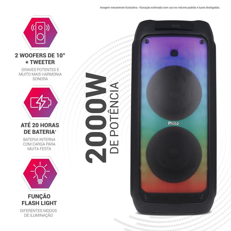 Transforme seus momentos em casa ou nas festas com a Caixa de Som Amplificada 2000W Philco PCX10101. Com 2000W de potência, ela entrega uma experiência sonora vibrante e envolvente, fazendo com que você sinta cada batida da música. Sua bateria interna garante até 20h de festa ininterrupta, enquanto o Bluetooth 5.3 oferece conectividade estável com até 10m de distância. Imagine unir várias caixas de som Philco e criar uma festa ainda maior com a função Philco Connection, que permite reproduzir a mesma música simultaneamente em todos os dispositivos conectados. Já o design com dois woofers de 10” e tweeter dessa Caixa de Som Amplificada oferece graves profundos e nítidos, e o recurso EX BASS ajusta o som conforme sua preferência. As luzes Flash Light e Full Led tornam cada evento ainda mais especial, com cores e efeitos personalizáveis que animam o ambiente. Além disso, as múltiplas entradas garantem que você ouça sua música do jeito que preferir, seja via Bluetooth, entrada auxiliar, pen drive, cartão TF ou rádio FM. Eleve o nível da sua diversão e praticidade no dia a dia com a Caixa de Som Amplificada PCX10101 da Philco.• Entrada USB • Entrada de cartão TF• Rádio FM com memorização de estações• 2 x Entradas Microfone e 1 Entrada para Guitarra• Entrada Auxiliar P2• Bluetooth V5.3• Philco connection TWS• 2 x Woofer de 10” e Tweeter• Flash Light e Full Led• 5 opções de equalização• Controle Remoto• Fonte de alimentação 15V/4A• Autonomia de 20h com uso em 50% do volume e luzes desligadas.