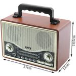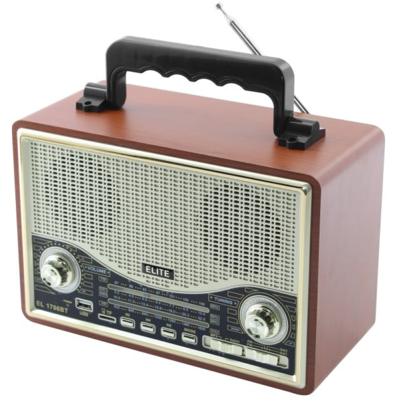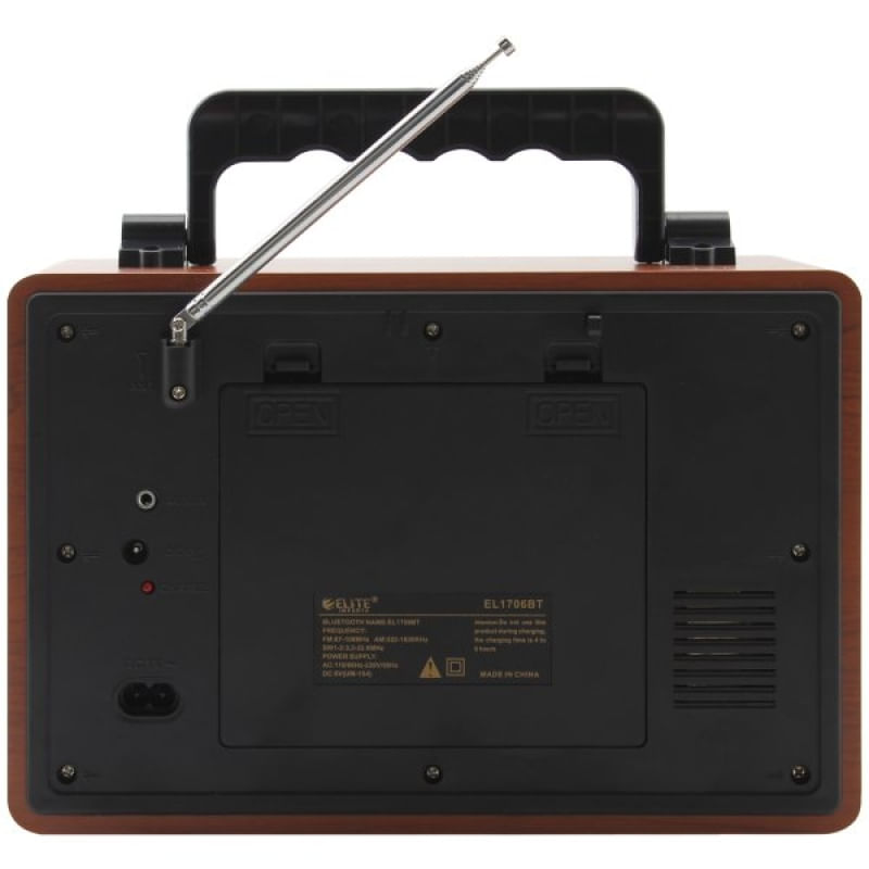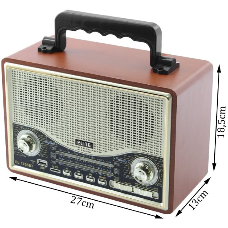 Caixa De Som Bluetooth USB SD Rádio FM Bege EL1706BT - capacidade que ainda conta com entrada para pilhas para auxiliar na autonomia, esse rádio portátil é indispensável para quem gosta de som de qualidade e com um visual retro que segue a tendência da moda, com ótima recepção FM/AM ainda conta com entrada para cartão SD e auxiliar. Este rádio suporta: • Fm / Am • Entrada USB • Slot tf card • Conexão bluetooth • Entrada AUX Tipos de alimentação: • Via cabo REMOVÍVEL em corrente direta, Chave seletora ac 110v/60hz-220v/50hz/dc 5v / 2A Bivolt • Contém bateria interna • Ainda é possível a utilização de 4 pilhas auxiliares tipo "D" 1,5V Especificação de áudio: • Frequência: Am: 522-1620khz / Fm: 87-108 mhz • Rádio stéreo • Rms: 4.0 polegadas alto-falante 8w ATENÇÃO: Quando a energia se esgotar, é sugerido que efetue o carregamento completo para então usar novamente, isso aumenta a vida útil da bateria interna. Características Gerais do Produto: • Material: Plástico; Componentes eletrônicos • Cor: Bege • Dimensões aproximadas: - Altura: 18,5cm --- Largura: 13cm --- Comprimento: 27cm • Potência: 8W Garantia: • Garantia do site - 1 Mês