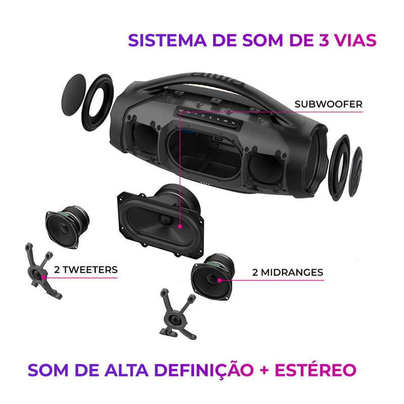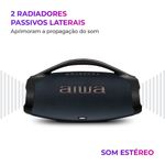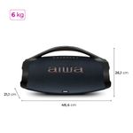 Reunir nossa família e amigos e desfrutar de uma boa música é um dos prazeres da vida, né? Curta um som potente e de alta definição com a Boombox Light Plus AWS-BBS-01-LBL! A caixa de som portátil foi projetada com sistema de som de 3 vias - 1 subwoofer, 2 midranges e 2 tweeters -, além de ter dois radiadores passivos laterais, 200W RMS de potência e o DNA japonês da marca AIWA. Com o certificado IP66, você e sua turma podem ouvir sua playlist favorita na beira da piscina ou na praia sem preocupação, já que a Boombox é resistente a jatos potentes de água e tem proteção total contra poeira. Incrível, né? Saiba mais sobre a Boombox Light Plus AWS-BBS-01-LBL: 200W RMS DE POTÊNCIA Sinta a experiência sonora impactante com os 200W RMS de potência da caixa portátil AIWA. Você será levado pela música com graves mais profundos e som potente. E, com a tecnologia Energy Saving, você mantém os 200W de potência até ouvindo música na bateria (fora da tomada). SOM DE ALTA DEFINIÇÃO COM 3 VIAS Preencha o ambiente com um som AIWA potente! Projetado com o sistema de som de 3 vias (3-Way Speaker System), a Boombox Light Plus AWS-BBS-01-LBL possui 1 subwoofer, 2 midranges e 2 tweeters, além de 3 amplificadores de áudio, um para cada canal (grave, médio e agudo), e com resposta de frequência dinâmica de 20Hz - 20KHz. O resultado? Uma experiência sonora com a pureza do DNA japonês AIWA®! Garantia de vocais claros e nitidez nos detalhes, assegurando um som perfeito e sem distorções. RADIADORES PASSIVOS A Boombox conta com dois radiadores passivos laterais, que atuam em conjunto com os alto-falantes para aprimorar a propagação do som. LED COLOR LIGHTS Crie a atmosfera perfeita para o ambiente da sua festa com os 6 tipos de luzes dinâmicas com efeitos multicoloridos. Um ambiente animado cuja iluminação se movimenta de acordo com as batidas, prometendo momentos inesquecíveis! E tem mais: você pode controlar a intensidade e o modo da luz diretamente do app da AIWA Brasil. PROTEÇÃO IP66: RESISTENTE A POEIRA + ÁGUA Caixa de som duplamente protegida: check! Você pode fazer uma festa na beira da piscina ou curtir uma música à beira-mar, que sua boombox estará protegida! O certificado IP66 garante resistência a jatos potentes de água e resistência total contra poeira. ATÉ 30 HORAS DE BATERIA Divirta-se em todos os momentos com as músicas que você ama: do treino matinal até uma noite com os amigos. Com até 30 horas* de bateria, você pode ouvir suas playlists o dia todo e ainda noite adentro, sem precisar recarregar. (*) 30 horas com 50% do volume e luzes desligadas. A duração real da bateria varia conforme as condições de uso. POTÊNCIA PLUS A tecnologia Energy Save garante que, tanto na bateria quanto na tomada, a potência da reprodução do som continue 100% a mesma. BLUETOOTH 5.3 Faça o pareamento da caixa de som portátil com seu smartphone via Bluetooth e curta suas playlists! Com a versão 5.3, a conexão é mais rápida e estável e o consumo de bateria é menor. FUNÇÃO TWS: DUPLIQUE SUA EXPERIÊNCIA Com a tecnologia TWS (True Wireless Sound), você sincroniza duas Boombox Light Plus AWS-BBS-01-LBL e duplica a potência sonora. SEU SOM TA ON Controle as batidas da sua boombox pelo celular baixando o aplicativo AIWA Brasil. LEVE PARA QUALQUER LUGAR! Com a alça de transporte, fica fácil levar suas músicas favoritas com você para qualquer lugar.