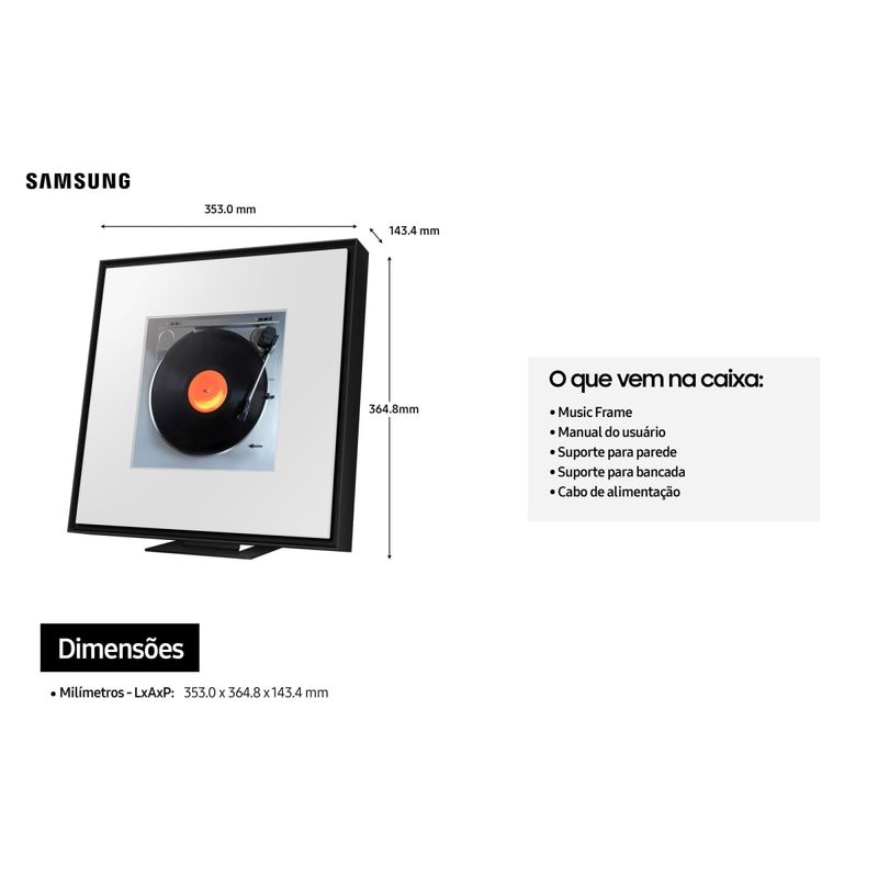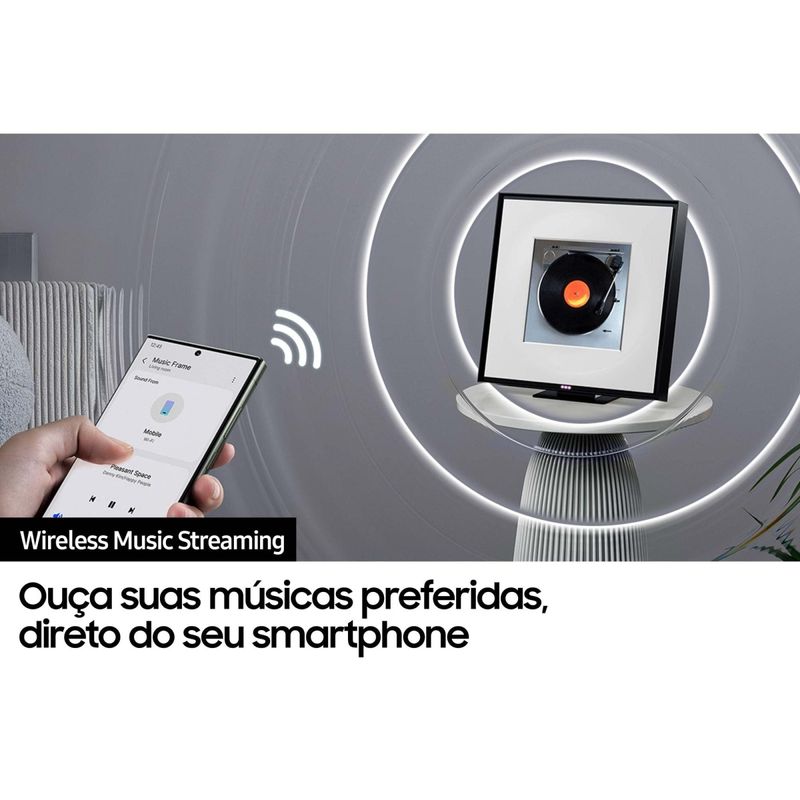 Music Frame Samsung HW-LS60D/ZD: une o poder do som com o charme da decoração moderna! Music Frame Samsung HW-LS60D/ZD é uma caixa de som inteligente com design de quadro, perfeita para quem busca tecnologia e estilo no mesmo produto. Art Panel Com o exclusivo Art Panel, você pode personalizar a parte frontal com uma imagem ou foto impressa, transformando o speaker em uma verdadeira peça de arte. Além disso, o design elegante e as molduras customizáveis permitem que a Music Frame se integre perfeitamente ao ambiente. Potência de 120W Por trás da aparência decorativa, há uma caixa de som de 120W com 6 alto-falantes integrados e tecnologia Dolby Atmos®, proporcionando um áudio tridimensional e imersivo. O som é distribuído de forma uniforme pelos 3 conjuntos de saídas multidirecionais (Tweeter x2, Mid x2 e Dual Woofer), garantindo clareza e equilíbrio em qualquer ponto da sala. Conectividade Conecte seu smartphone via Wi-Fi ou Bluetooth e ouça suas playlists favoritas com qualidade excepcional. Compatível com Alexa Built-in, a Music Frame oferece controle por voz e integração com outros dispositivos inteligentes da sua casa. Design de quadro personalizável com Art Panel Som imersivo 2.0 canais com Dolby Atmos® Conectividade Bluetooth e Wi-Fi Controle por voz com Alexa integrada Descubra mais produtos com a tecnologia e inovação Samsung e complete a sua casa!