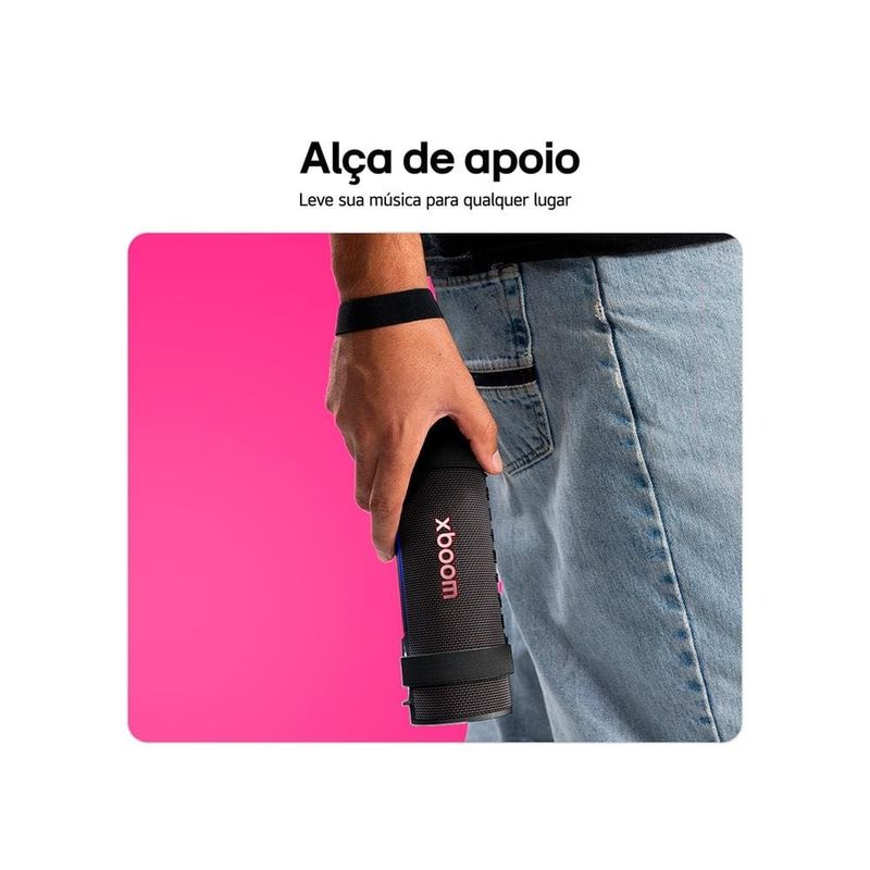 Caixa de Som LG XBoom Grab by will.i.am - Une potência, resistência e inovação! Collab by will.i.amCriada em colaboração com will.i.am, todos os efeitos sonoros do produto foram desenvolvidos exclusivamente para entregar uma experiência única ao conectar, ligar/desligar ou ajustar o volume.Inteligência ArtificialInteligência Artificial adaptativa embarcada que proporciona um som personalizado com base no gênero da música e no ambiente em que você está. Potência 30W RMSCom potência de 30W RMS, 1.1 canais e 2 alto-falantes, garantem som potente, limpo e envolvente. A conectividade bluetooth e USB-C torna a experiência rápida e prática.Bateria DurávelBateria de 20 horas: apesar do tamanho compacto e do peso de apenas 700g, esta caixa de som oferece autonomia para o dia todo, perfeita para aventuras, festas e viagens. Resistência MilitarTestada em 7 condições extremas – incluindo alta temperatura, vibração, impacto, chuva, maresia e poeira – esta caixa de som atende ao padrão MIL-STD dos EUA. Além disso, possui proteção IP67, resistente à poeira e submersão em até 1 metro de água doce por 30 minutos.Experiência sonora exclusiva by will.i.am30W RMS de potência em 1.1 canalProteção IP67 + certificação militarAté 20 horas de reprodução contínuaA caixa de som também conta com alça ajustável para você levá-la para qualquer lugar, mesmo ao ar livre.Conheça mais produtos com a inovação e tecnologia LG!