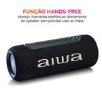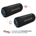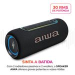 A caixa de som portátil AWS-SP-05-LB da Aiwa foi desenvolvida para oferecer potência sonora e facilidade de uso em qualquer rolê. Com 30W RMS de potência, ela entrega áudio alto e bem definido, cobrindo desde graves encorpados até agudos claros graças aos 2 woofers de 8 polegadas e 2 radiadores passivos laterais, que trabalham em conjunto com os alto-falantes para aprimorar a propagação do som.A entrada USB com função passa-pasta e a bateria de até 6 horas tornam o SP-05-LB ideal para quem quer curtir suas playlists em qualquer lugar, sem depender de tomadas.Com certificação IPX5, que protege contra jatos de água, o speaker portátil da Aiwa pode ser usado em ambientes externos e à beira da piscina. Para deixar sua experiência ainda mais incrível, ele tem design moderno com LED lateral, com sete modos de luzes dinâmicas que acompanham o ritmo das batidas.A conexão via Bluetooth 5.3 oferece emparelhamento estável, rápido e eficiente. E, graças à função TWS, você pode conectar – sem uso de fios – dois AWS-SP-05-LB para duplicar sua experiência sonora e de luzes coloridas.Prático e versátil, este speaker portátil da Aiwa ainda conta com função hands-free, que permite atender chamadas telefônicas diretamente do speaker – e sem precisar usar as mãos.Além de tudo, a caixa de som vem com cordão de transporte para você levar seu aparelho para onde quiser. Saiba mais sobre a AWS-SP-05-LB:30W RMS de potência: Qualidade para ouvir suas playlists.Controle pelo seu smartphone: Basta baixar o aplicativo Aiwa BR Audio.Cordão de transporte: Leve seu speaker para onde quiser.6 horas de bateria: Autonomia para escutar suas músicas, sem depender de tomada.Proteção IPX5: Resistente a jatos d’água, ideal para áreas externas e momentos à beira da piscina.LED Color Lights: Sete modos de luzes dinâmicas com efeito multicolorido que acompanham o ritmo das batidas.Entrada USB com função passa pasta: Para ouvir suas músicas.Bluetooth 5.3: Conexão rápida, estável e com menor consumo de energia;2 radiadores passivos laterais: Reforçam os graves com mais profundidade e clareza, permitindo um som potente.TWS (True Wireless Sound): Emparelhe dois AWS-SP-05-LB sem fio, com som e luzes sincronizados.