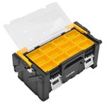 Descrição do Produto - Indicado para organizar e armazenar ferramentas, peças e acessórios em geral - Fabricado em Polipropileno - Alça em alumínio - Possui 2 travas em aço galvanizado, 1 compartimento na tampa com 12 bandejas móveis em plástico ABS - Capacidade de carga de 14 kg - Cor: Preto / amarelo / cinza e transparenteSKU: 11051822