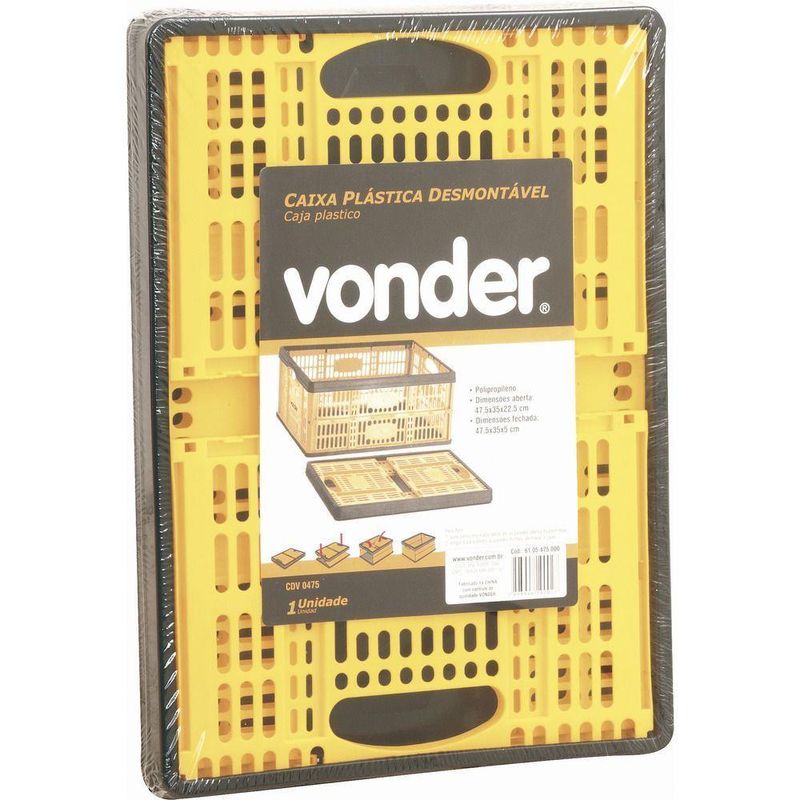 Caixa Plástica Desmontável 475x350x225mm 10kg Cdv0475 VonderConteúdo da embalagem1 Caixa plásticaAplicações e dicas de usoIndicada para organizar, armazenar e transportar ferramentas, peças e acessórios em geralDestaques e diferenciaisPor ser desmontável, ocupa pouco espaço na hora de guardá-la vaziaDETALHES TÉCNICOSComprimento da caixa plástica:475,0 mmLargura da caixa plástica:350,0 mmAltura da caixa plástica:225,0 mmMaterial da caixa plástica:PolipropilenoCor da caixa plástica:Preta e amarelaCapacidade de carga:10 kg Produto: Caixa | Com rodas: Não | Inclui bandeja extensível: Não | Material: Plástico | Com alça: Sim | Condição do item: Novo | É kit: Não