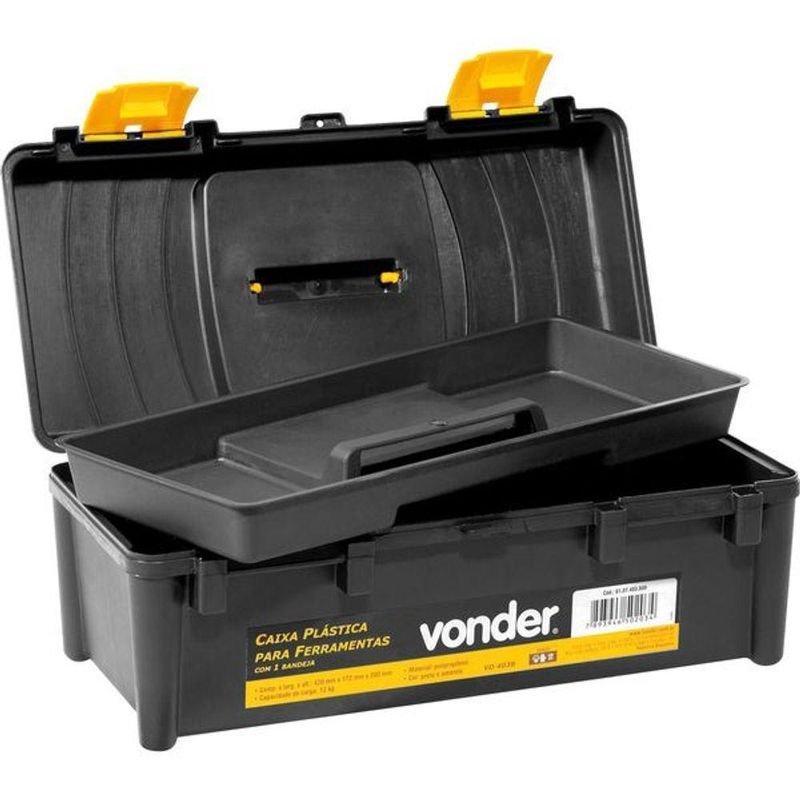 Caixa Plástica Ferram Baú 420x170x200mm Vd4038 VonderConteúdo da embalagem1 Caixa plásticaAplicações e dicas de usoIndicada para organizar, armazenar e transportar ferramentas, peças e acessórios em geralDestaques e diferenciaisPossui alça e fecho em polipropileno virgem, com uma bandeja removívelDETALHES TÉCNICOS Comprimento da caixa plástica: 420,0 mm Largura da caixa plástica: 172,0 mm Altura da caixa plástica: 200,0 mm Material da caixa plástica: Polipropileno Cor da caixa plástica: Preto Capacidade de carga: 12 kg Produto: Caixa | Com rodas: Não | Inclui bandeja extensível: Sim | Material: Plástico | Com alça: Sim | Condição do item: Novo | É kit: Não