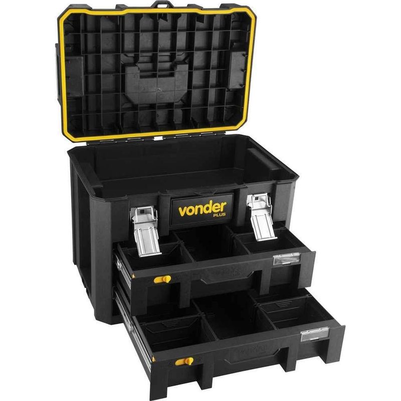 Caixa Plástica Para Ferramentas Cpv 900 Vonder PlusCaixa Plástica Para Ferramentas CPV 900 Vonder Plus -Conteúdo da embalagem: 1 Caixa plástica.Aplicação: Indicada para organizar, armazenar e transportar ferramentas, peças e acessórios em geral.Destaques: Possui 3 compartimentos, sendo 1 baú, 2 gavetas com travas e 6 divisões. Dimensões baú: comprimento: 490 mm x largura: 300 mm x altura: 100 mm. Dimensões gavetas: comprimento: 410 mm x largura: 280 mm x altura: 85 mm. Possui vedação contra água na parte do baú, IP53. Conta com alça emborrachada para transporte, além de porta-cadeado e fechaduras metálicas reforçadas. Permite ser acoplada na Bolsa em Lona BL 900 (35.40.900.000), no Organizador Plástico OPV 900 (61.08.009.000) e Caixa Plástica para Ferramentas, com Rodas, CRV 900 (61.05.090.000) (não acompanham).Garantia - E (CDC): Garantia legal: 90 diasReferência: 6105000900Modelo: CPV 900Material: PolipropilenoCor da caixa: Preta e amarelaComprimento: 525 mmLargura: 330 mmAltura: 390 mmCapacidade de carga (kgf): 34 kgfMassa aproximada (peso): 8,5 kgDestaques Comercial: Caixa com 3 compartimentos (1 baú, 2 gavetas), vedação IP53, alça emborrachada e opção de acoplamento aos modelos BL 900, OPV 900 e CRV 900.Aplicação Comercial: Indicada para organizar, armazenar e transportar ferramentas, peças e acessórios.Características Gerais do Produto:Garantia: - 3 Meses
