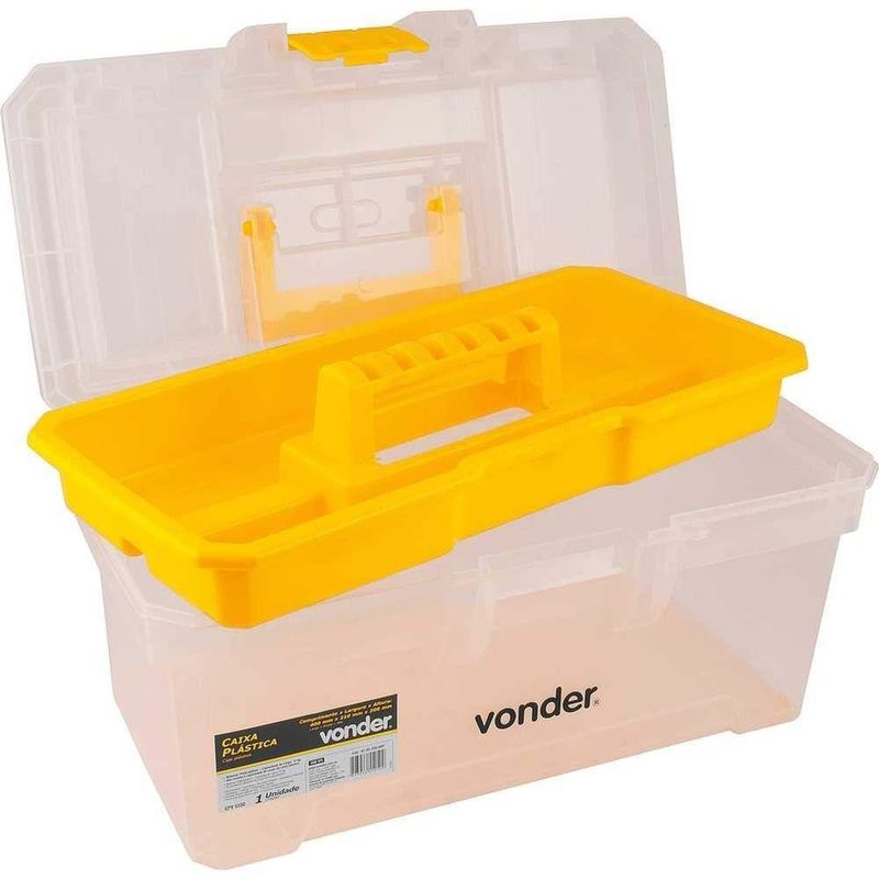 Caixa Plástica Para Ferramentas, Transparente E Amarela, Com 1 Bandeja, Cpv 0330, VonderCaixa Plástica Para Ferramentas, Transparente e Amarela, com 1 Bandeja, CPV 0330, Vonder -Conteúdo da embalagem: 1 Caixa plástica.Aplicação: Indicada para organizar, armazenar e transportar ferramentas, peças e acessórios em geral.Destaques: Possui uma bandeja removível para ferramentas.Referência: 6105330000Garantia - E (CDC): Garantia legal: 90 diasModelo: CPV 0330Material: PolipropilenoCor da caixa: Transparente e amarelaComprimento: 400 mmLargura: 210 mmAltura: 200 mmCapacidade de carga (kgf): 12 kgfMassa aproximada (peso): 1,134 kgDestaques Comercial: Possui uma bandeja removível para ferramentas.Aplicação Comercial: Indicada para organizar, armazenar e transportar ferramentas, peças e acessórios em geral.Características Gerais do Produto:Garantia: - 3 Meses