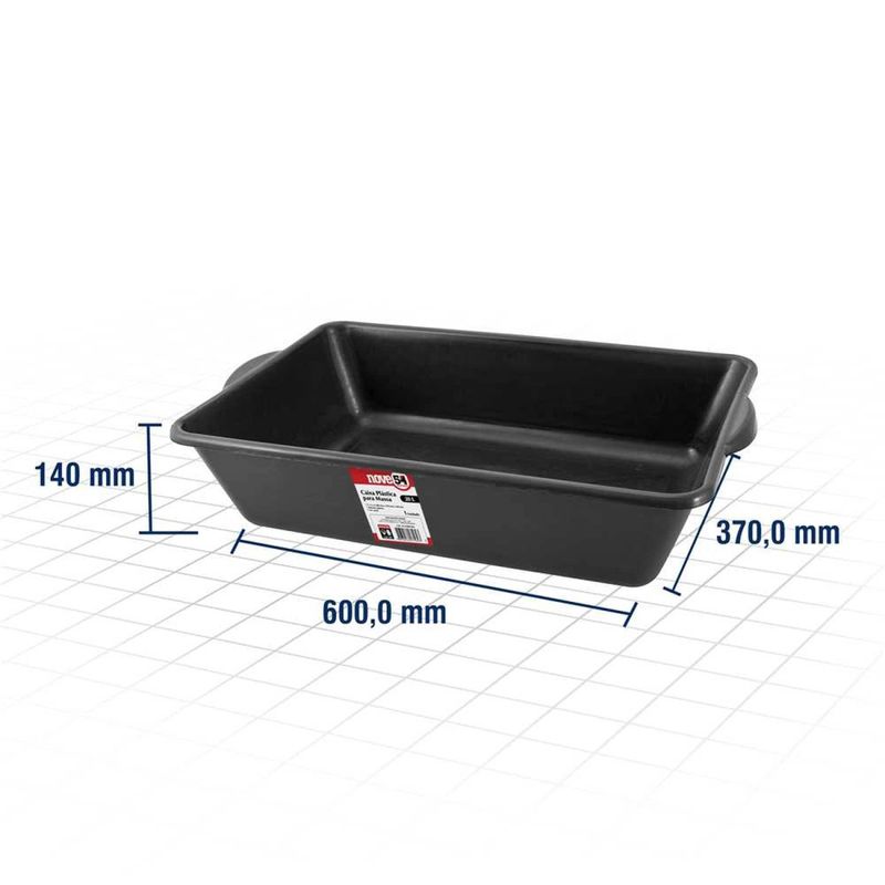 Caixa Plástica Retangular, Para Massa, 20 Litros, Nove54 - Conteúdo da embalagem: 1 Caixa plástica retangular. Aplicação: Indicada para construção civil. Destaques: Produzida em plástico, proporcionando facilidade no transporte. Referência: 3315002954 Garantia - E (CDC): Garantia legal: 90 dias Tamanho: 60 cm x 37 cm x 14 cm Material: Plástico Massa aproximada (peso): 0,752 kg Capacidade da caixa: 20 litros Cor: Preta Destaques Comercial: Produzida em plástico, proporcionando facilidade no transporte. Aplicação Comercial: Indicada para construção civil. Características Gerais do Produto: Garantia: • 3 Meses