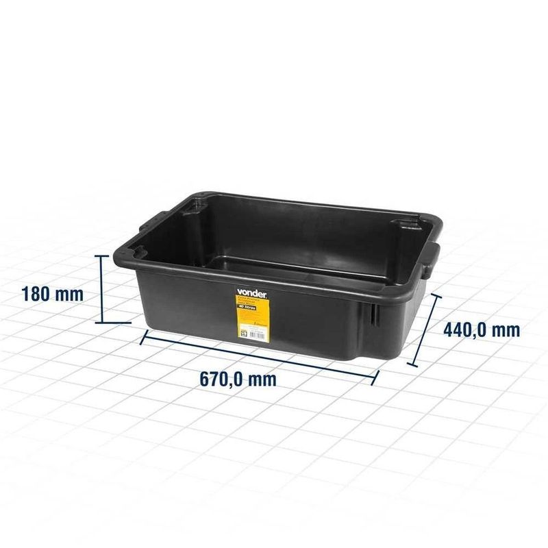Caixa Plástica Retangular, Para Massa, 40 Litros, Vonder OstenvonderCaixa Plástica Retangular, Para Massa, 40 Litros, Vonder OstenVonder -Conteúdo da embalagem: 1 Caixa plástica retangular.Aplicação: Indicada para uso geral, muito utilizada na construção civil para massa. Capacidade máxima aproximada: 40 kg.Destaques: Possui sistema de encaixe uma na outra, diminuindo o espaço de armazenamento e transporte.Referência: 3315400000Garantia - E (CDC): Garantia legal: 90 diasTamanho: 67 cm x 44 cm x 18 cmMaterial: PolipropilenoMassa aproximada (peso): 1,700 kgCapacidade da caixa: 40 litrosCor: PretaDestaques Comercial: Possui sistema de encaixe entre peças, reduzindo espaço de armazenamento e transporte.Aplicação Comercial: Uso geral na construção civil para massa. Capacidade máxima aproximada de 40 kg.Características Gerais do Produto:Garantia: - 3 Meses