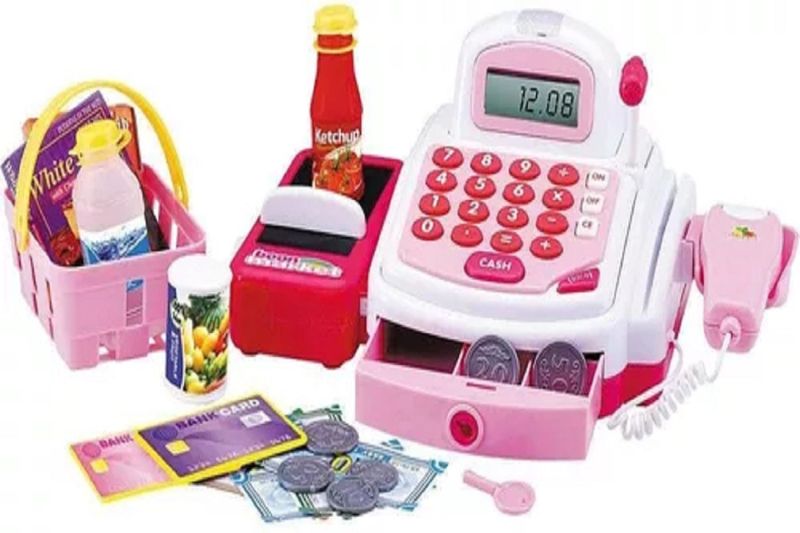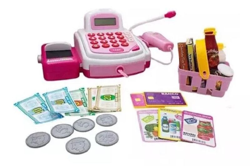 Essa caixa registradora é o presente perfeito para aquela criança que adora brincar de ir ao mercado, como os pais fazem. Acompanha diversos acessórios como notas, moedas e produtos. Esta na hora de fazer as comprinhas. As crianças adoram imitar os adultos nas brincadeiras e, ir ao mercado é uma dessas. Para a diversão ficar completa, essa caixa registradora vai ajudar na hora de comprar e pagar as comidinhas. Ela emite sons e luzes como as de verdade, balança para medir cada produto e gaveta para guardar as notas e moedas. Acompanha diversos acessórios para compor a brincadeira. Ideal para aguçar o aprendizado das crianças quanto ao valor e dinheiro. Com luz, som e Função de calculadora na máquina registradora. 1 caixa registradora 1 scanea com suporte 2 cartões card 1 chave 1 vegetable eamp; fruit 1 cesta com uma garrafa de ketchup, 1 garrafa de agua mineral 3 embalagens para bolo 6 moedas de plasticos 3 cartões de desconto 6 notas de dinheiro pequenas
