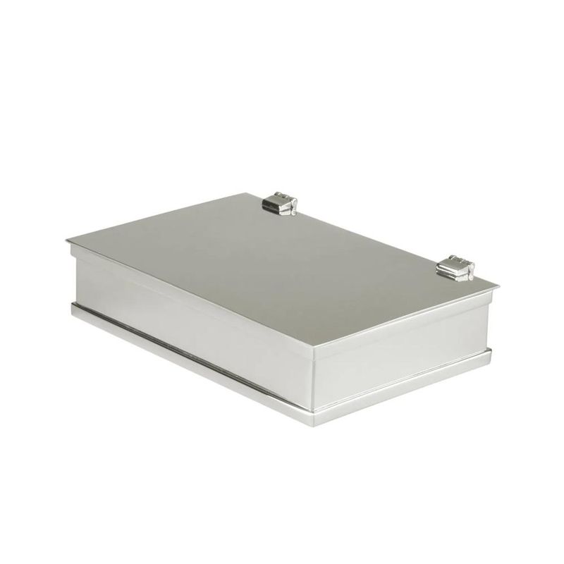 Luxo E Delicadeza: Caixa Retangular St. James A Caixa Retangular Prata é uma peça de luxo, muito charmosa e delicada, ideal para adicionar um toque de requinte à sua decoração. Com sua forma retangular e detalhes lisos, ela exala sofisticação discreta. É o acessório perfeito para ser utilizado como porta-joias, mantendo seus itens mais valiosos organizados e protegidos sob sua elegante tampa. Também pode ser usada para guardar pequenos tesouros ou como um item de destaque em penteadeiras e aparadores. Acabamento Premium e Durabilidade A Caixa Retangular Prata recebe um banho de prata previamente abrilhantada e endurecida, o que garante maior durabilidade e facilidade na manutenção. Este acabamento exclusivo da marca St. James assegura que o brilho e a elegância da prata se mantenham por muito tempo. Especificações Detalhadas: Formato: Retangular. Acabamento Premium: Banho de Prata previamente abrilhantada e endurecida. Design: Detalhes lisos e elegante tampa. Uso Ideal: Porta-joias ou caixa organizadora para objetos de valor. Marca de Prestígio: St. James (Referência: 610A). Durabilidade Reforçada: O banho de prata endurecido facilita a manutenção. Adquira agora a Caixa Retangular St. James e guarde seus tesouros com charme e sofisticação!