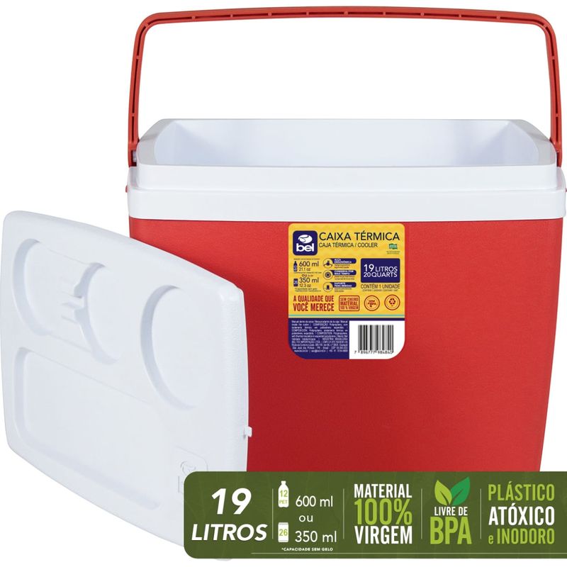 Caixa Térmica de 19 Litros Vermelha Bel: Mantenha Seus Alimentos e Bebidas Frescos por Mais Tempo Desfrute de momentos inesquecíveis com a Caixa Térmica de 19 Litros da Bel! Projetada para acompanhar você em todas as suas aventuras, seja na praia, em churrascos, acampamentos ou encontros familiares, esta caixa térmica garante que suas bebidas permaneçam geladas e seus alimentos frescos por muito mais tempo. Com capacidade para até 12 garrafas PET de 2L ou 26 latinhas de 350ml (sem gelo), ela é perfeita para compartilhar com amigos e familiares. Fabricada com polipropileno 100% virgem, livre de BPA, a Caixa Térmica Bel oferece segurança alimentar e resistência a odores, garantindo um armazenamento confiável. O isolamento térmico superior, proporcionado pelo Poliestireno Expandido (EPS), mantém a temperatura ideal por horas, enquanto o design inteligente com tampa com suporte para copos e trava de segurança, além da alça ergonômica, oferece praticidade e conforto no transporte. A limpeza é fácil e a durabilidade é incomparável, tornando esta caixa térmica a escolha ideal para quem busca qualidade e funcionalidade. Especificações Capacidade: 19 Litros Material: Polipropileno 100% Virgem (livre de BPA) Isolamento Térmico: Poliestireno Expandido (EPS) Itens Inclusos Caixa Térmica de 19 Litros Vermelha Bel Perguntas Frequentes (FAQ) Pergunta: Qual a capacidade da Caixa Térmica Bel?Resposta: A Caixa Térmica Bel possui capacidade de 19 Litros, comportando até 12 garrafas PET de 2L ou 26 latinhas de 350ml (sem gelo). Pergunta: A Caixa Térmica é segura para armazenar alimentos?Resposta: Sim, a Caixa Térmica Bel é fabricada com polipropileno 100% virgem, livre de BPA, garantindo armazenamento seguro e sem transferência de odores aos alimentos. Pergunta: Qual o tempo de conservação da temperatura?Resposta: O tempo de conservação da temperatura varia de acordo com as condições externas e a quantidade de gelo utilizada. O isolamento térmico em EPS garante a manutenção da temperatura por um período prolongado. Pergunta: Possui garantia?Resposta: Garantia legal: 90 dias